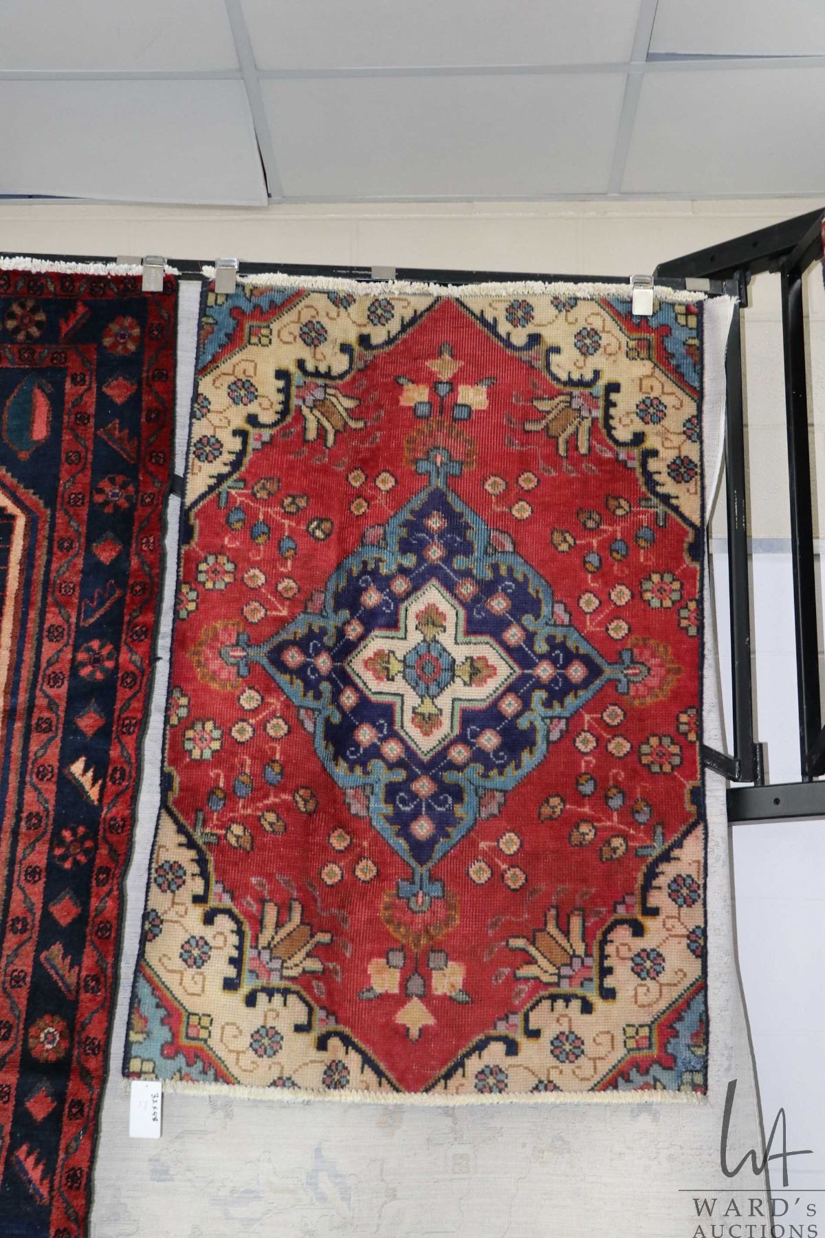 100% handmade Iranian wool carpet "Tabriz' with center medallion, red background and stylized floral design, highlights of blue, taupe and pink etc. 32" X 48"