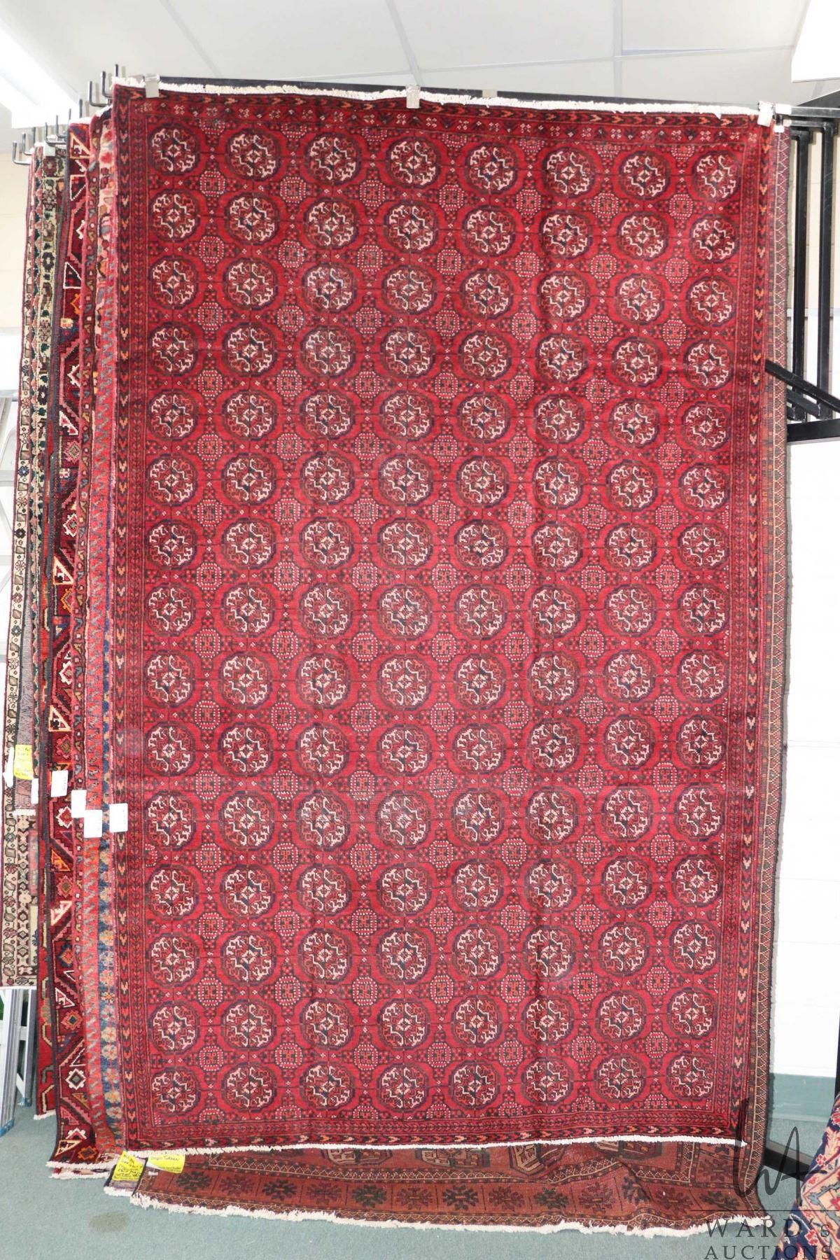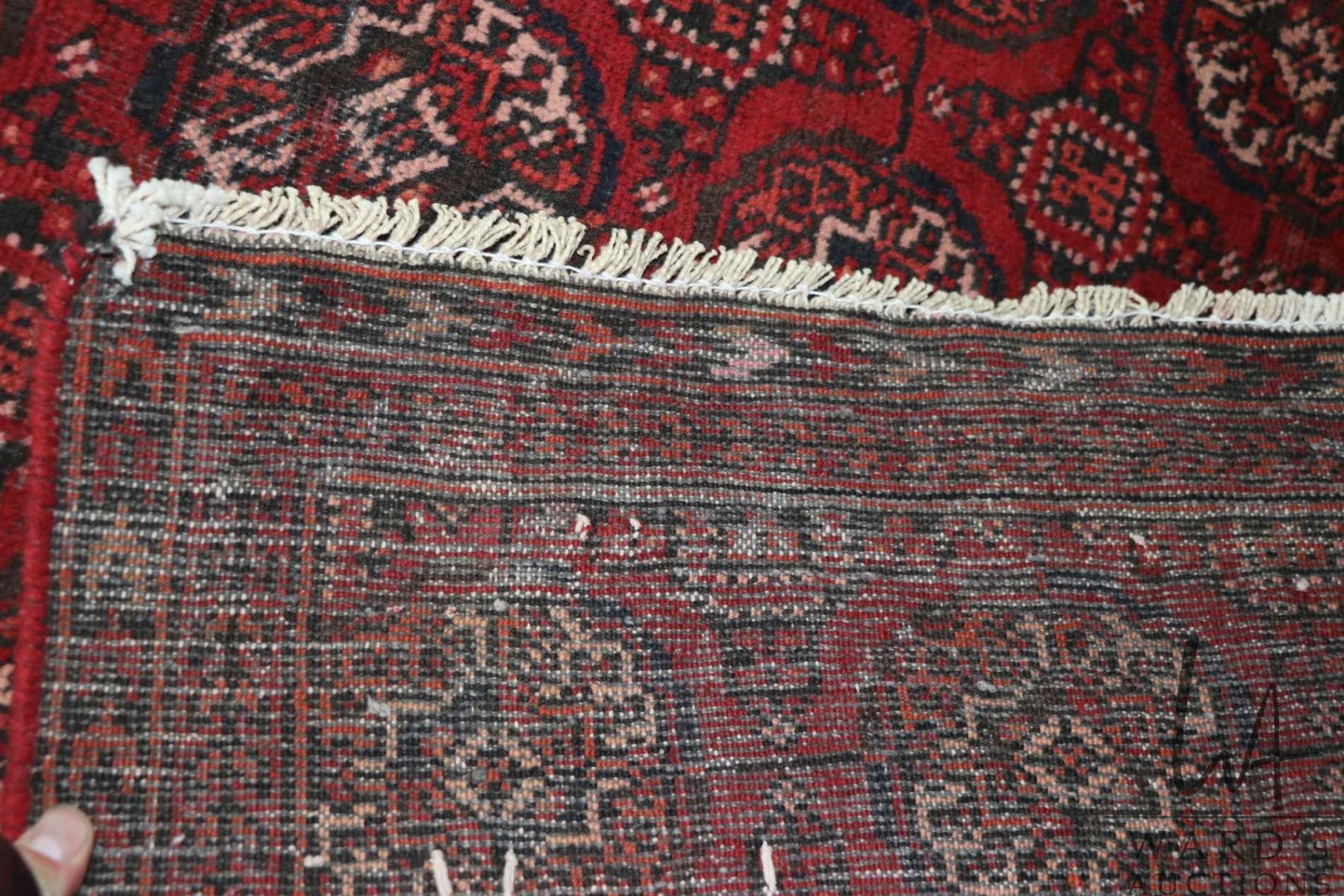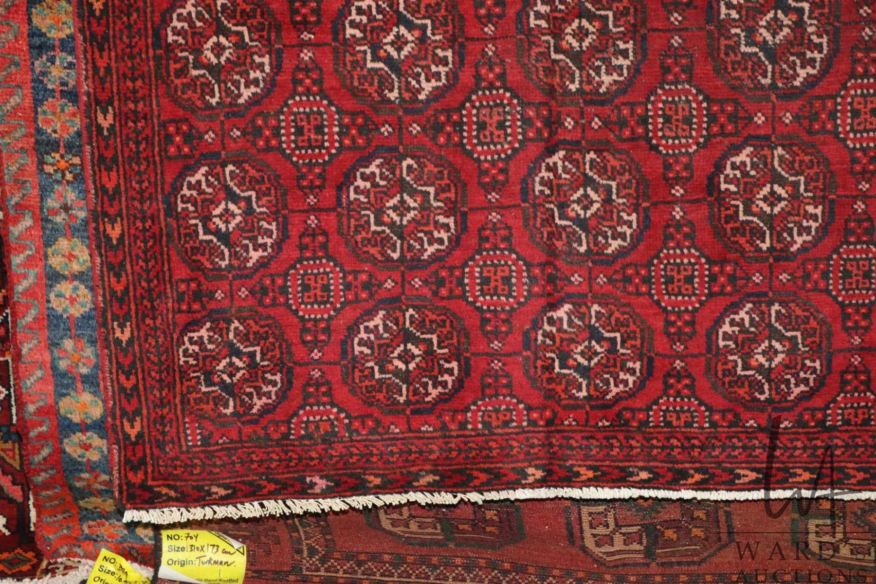 100% handmade Iranian wool carpet "Turkman" with overall geometric design, red background and highlights of black and cream etc. 67" X 109"