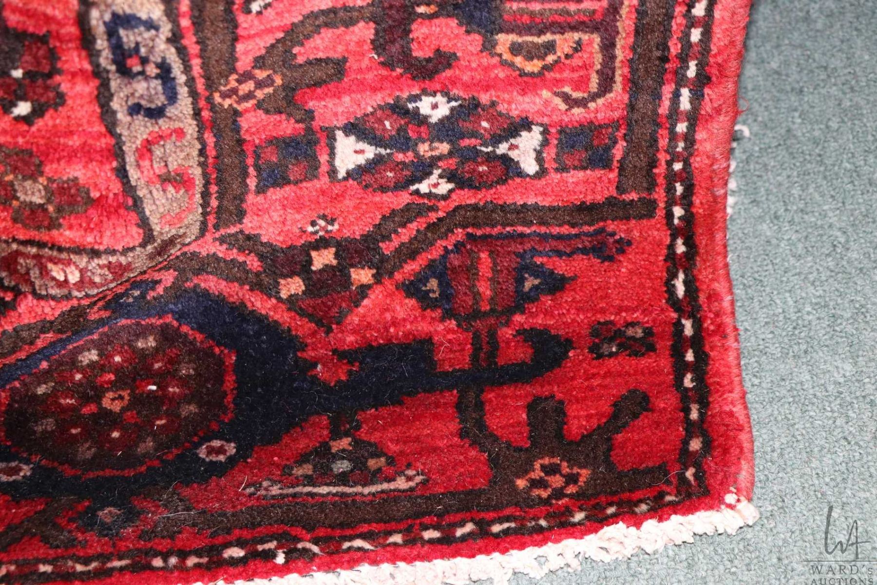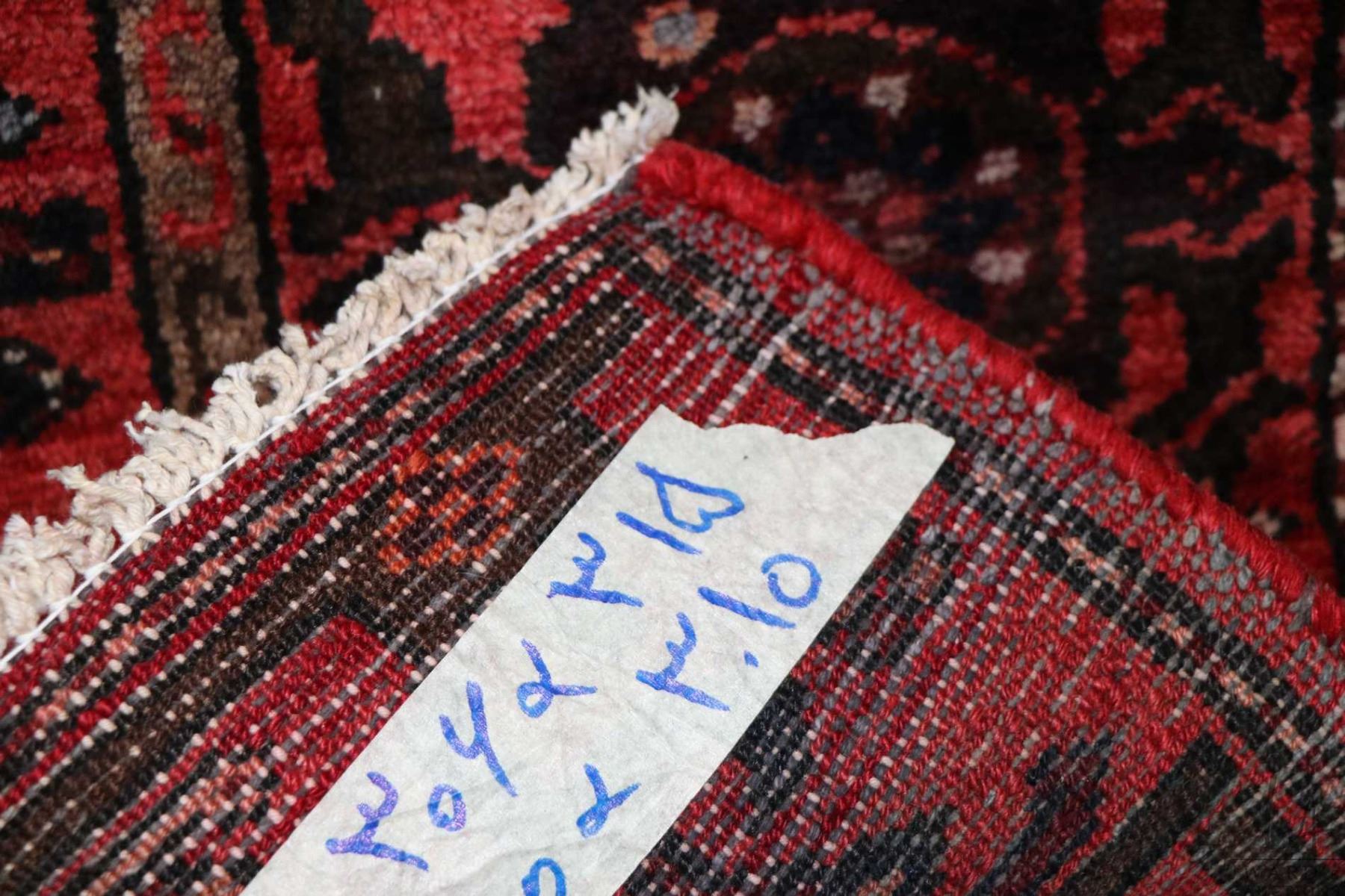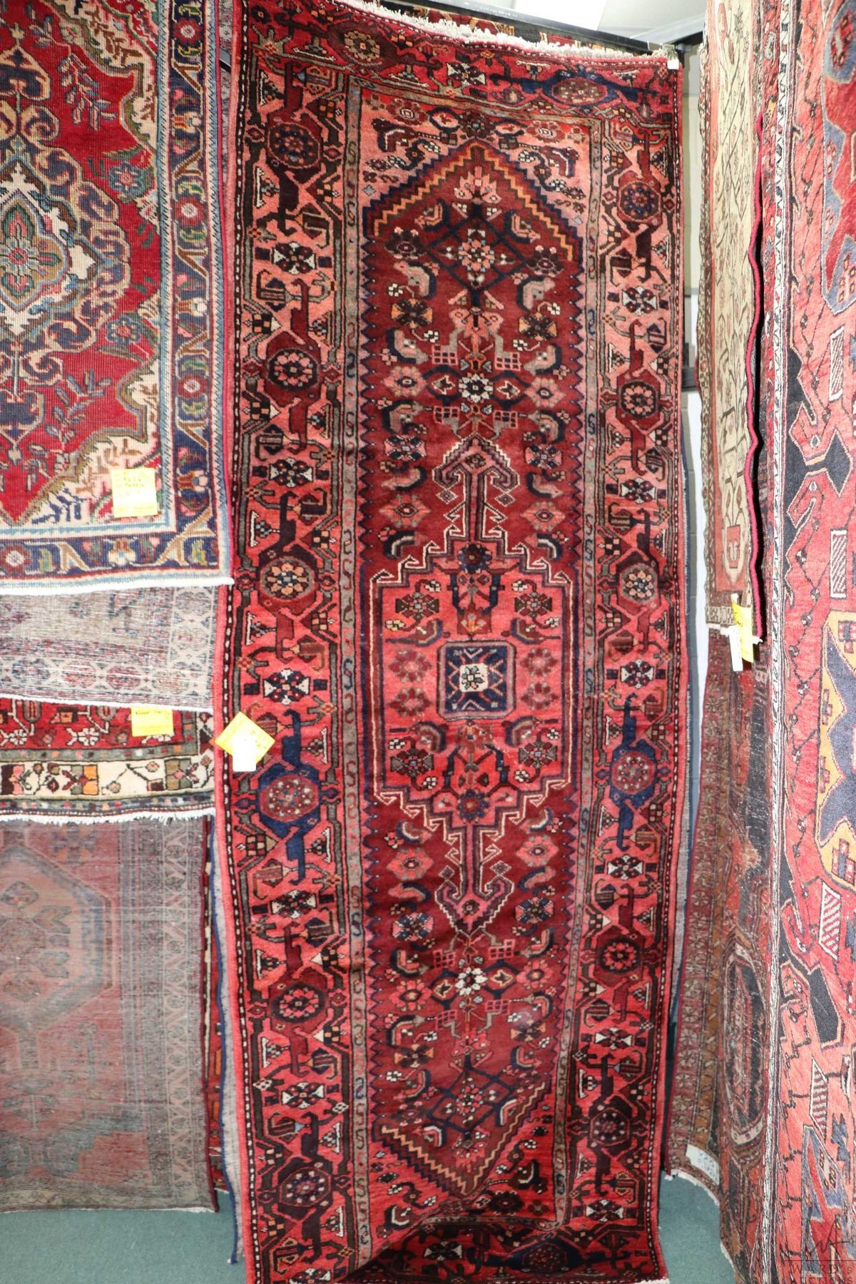 100% handmade Iranian wool carpet Zanjan with center medallion, stylized floral design, burgundy background and highlights of blue, taupe and cream, 46" X 120"