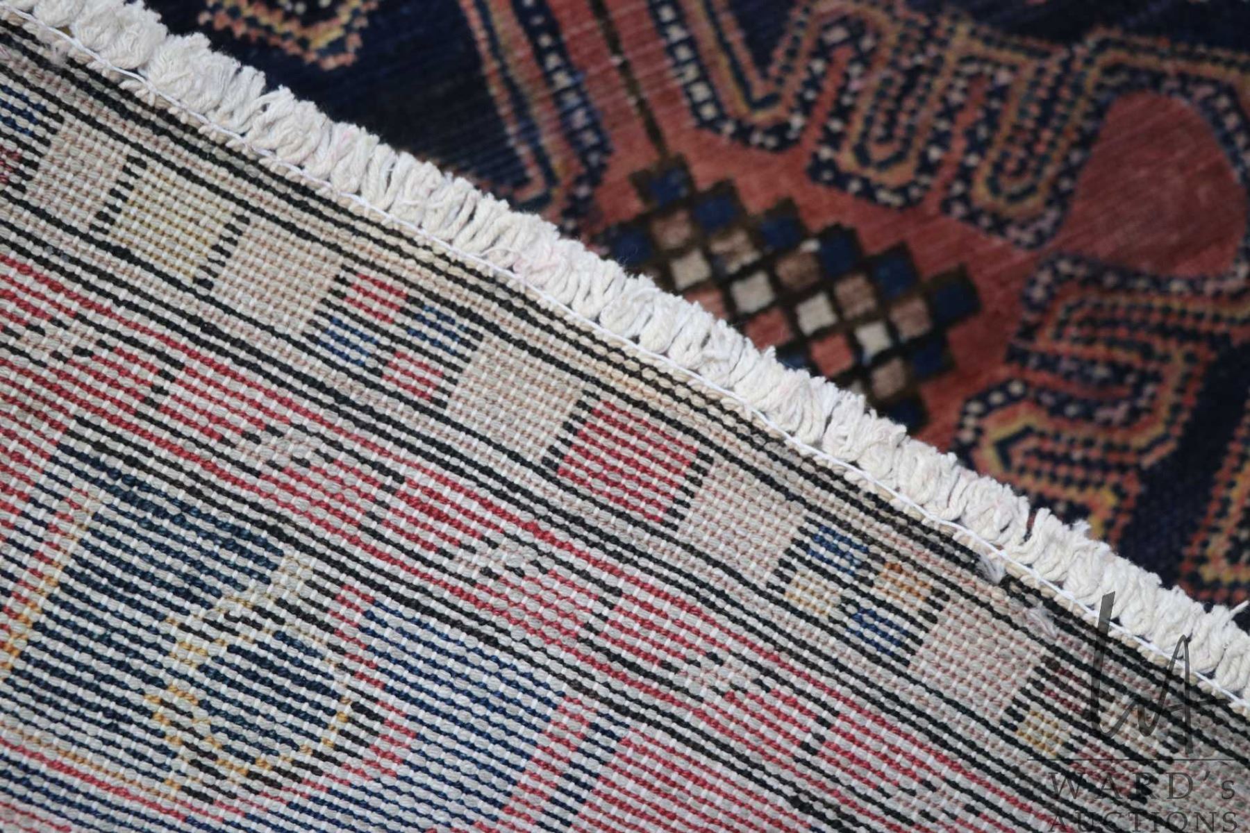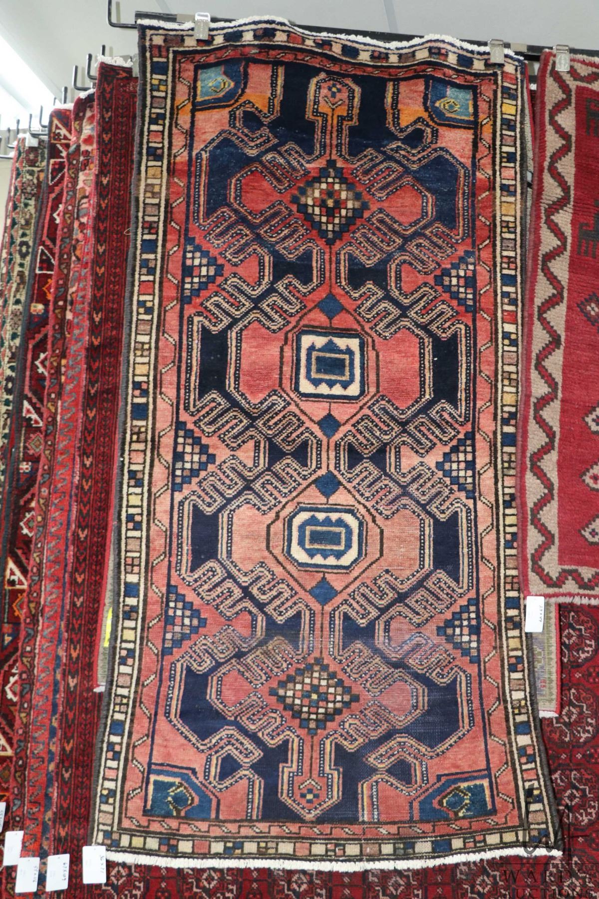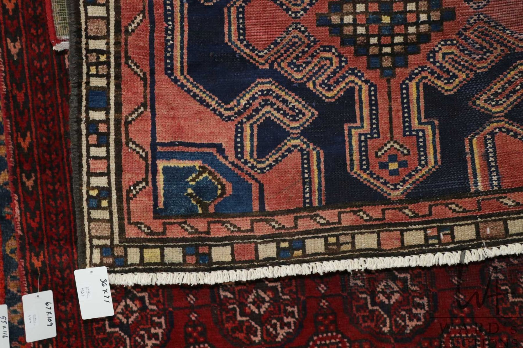100% handmade Iranian wool carpet "Zanjan" with multiple medallions, red background and highlights of blue, brown and cream etc. 36" X 71"