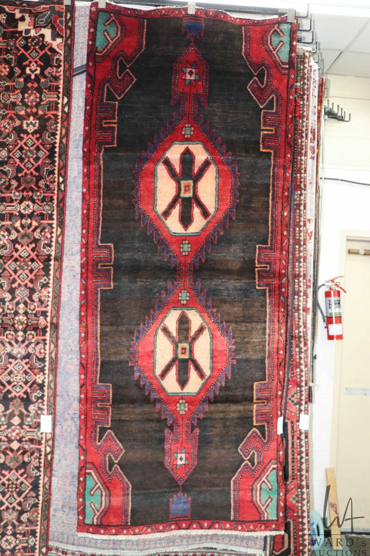 100% handmade Iranian wool carpet runner "Hamdan" with black background, double medallion and highli