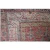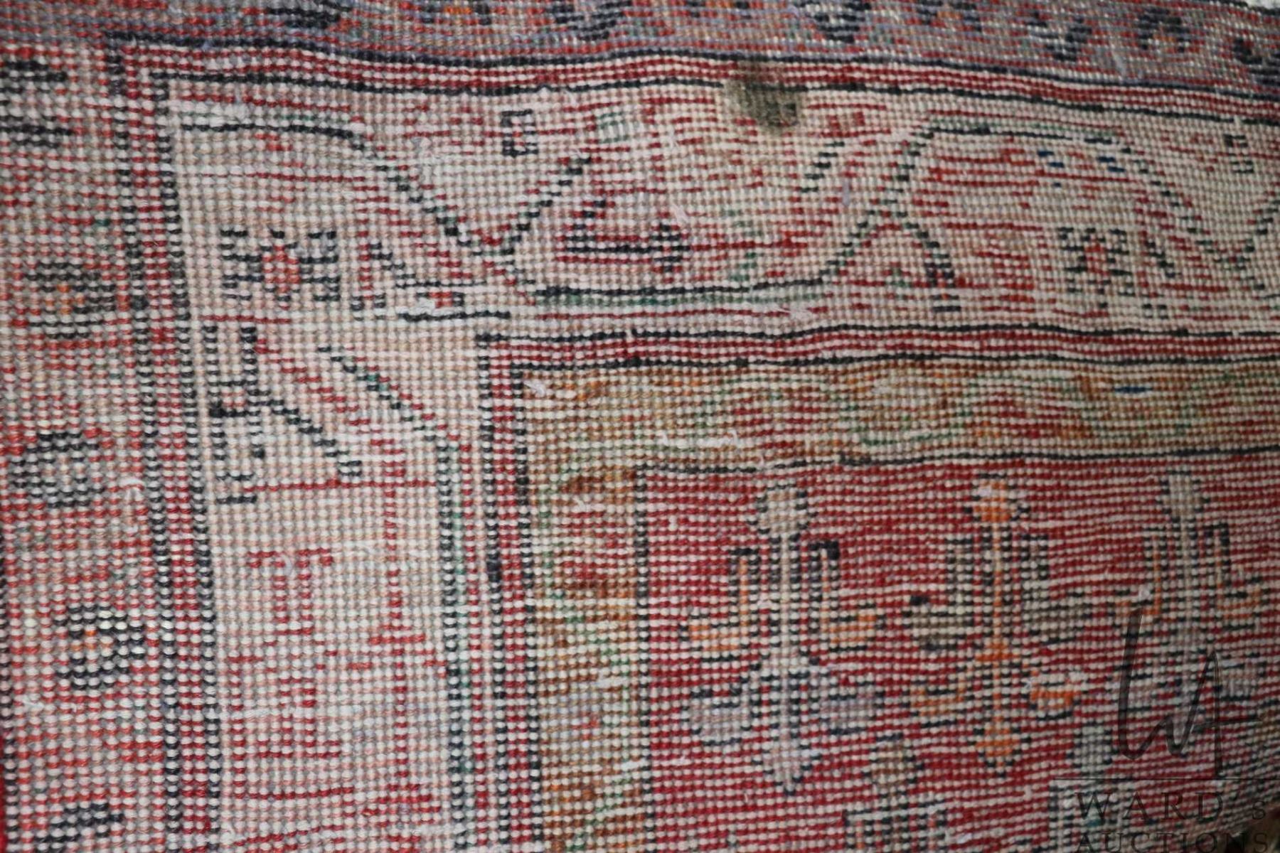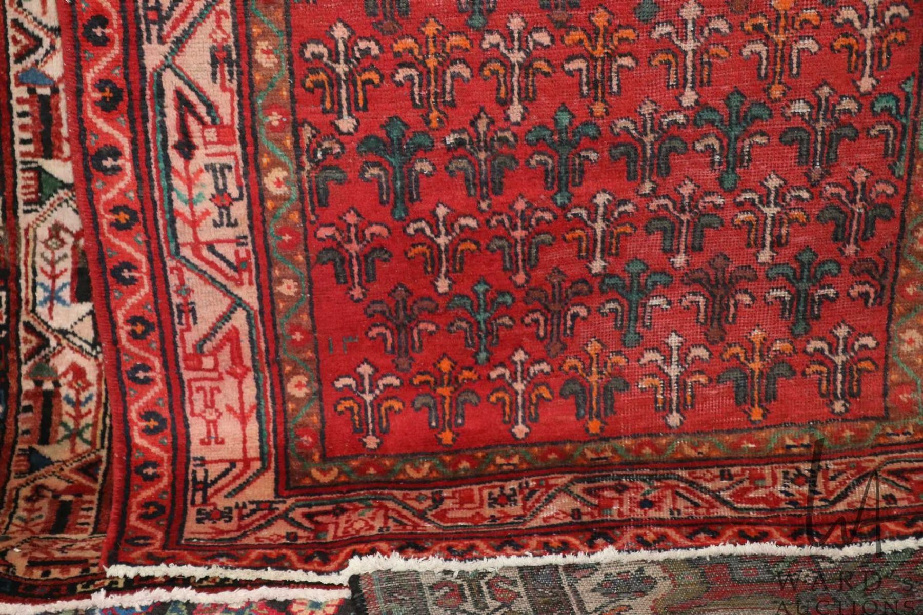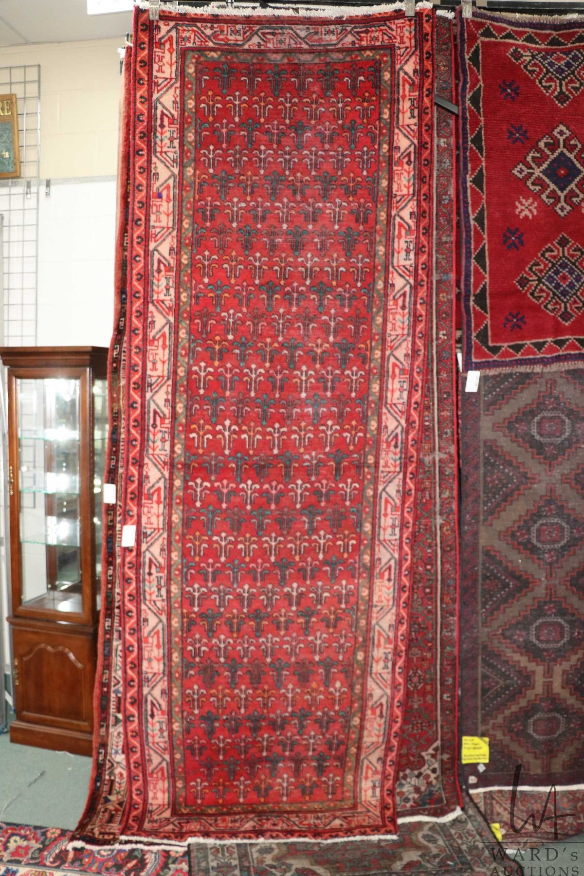 100% handmade Iranian wool carpet runner "Hamden" with geometric pattern, red background and highlights of green, orange and taupe etc. 41" X 121"