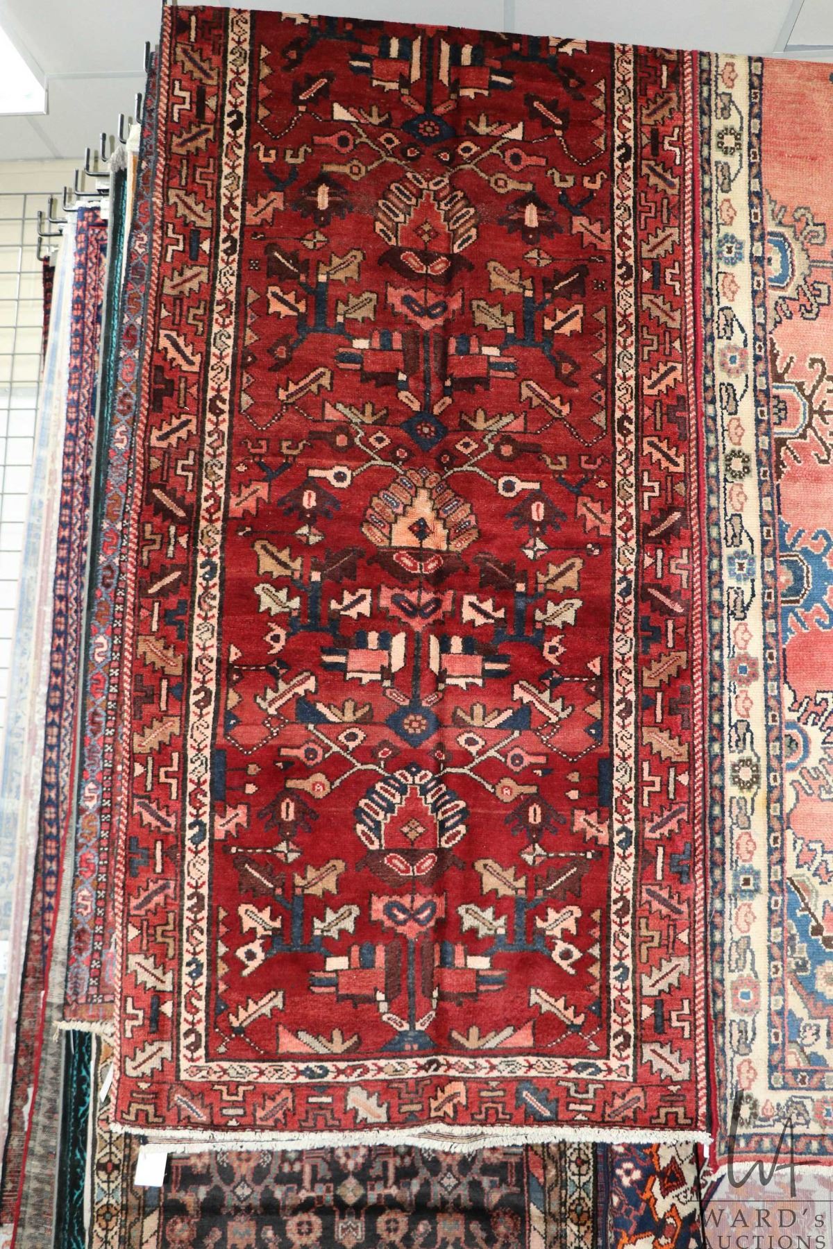 100% handmade Iranian wool carpet runner, "Zanjan" with red background, overall geometric pattern an