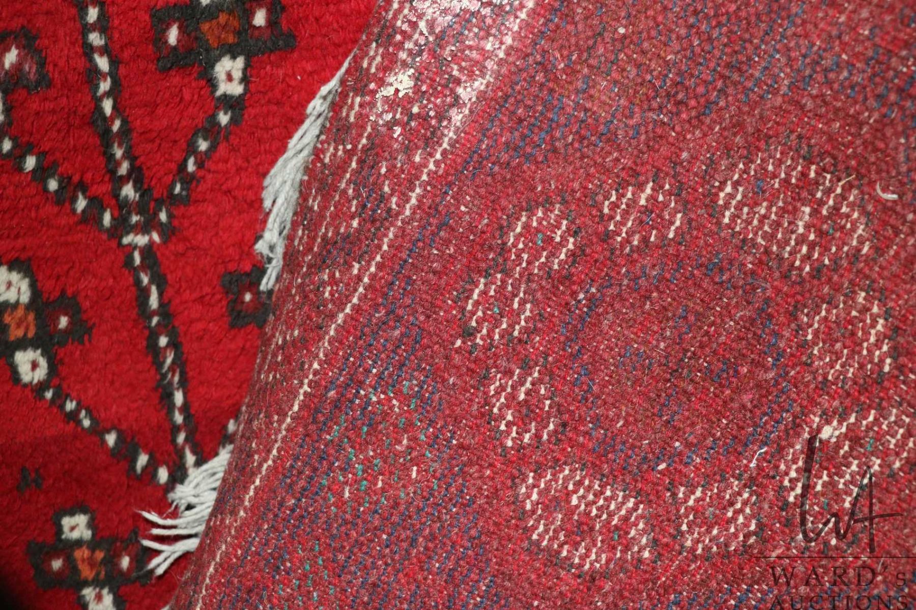100% handmade Iranian wool carpet with center medallion, red background and overall geometric pattern, highlights of cream, teal, blue etc. 77" X 108"