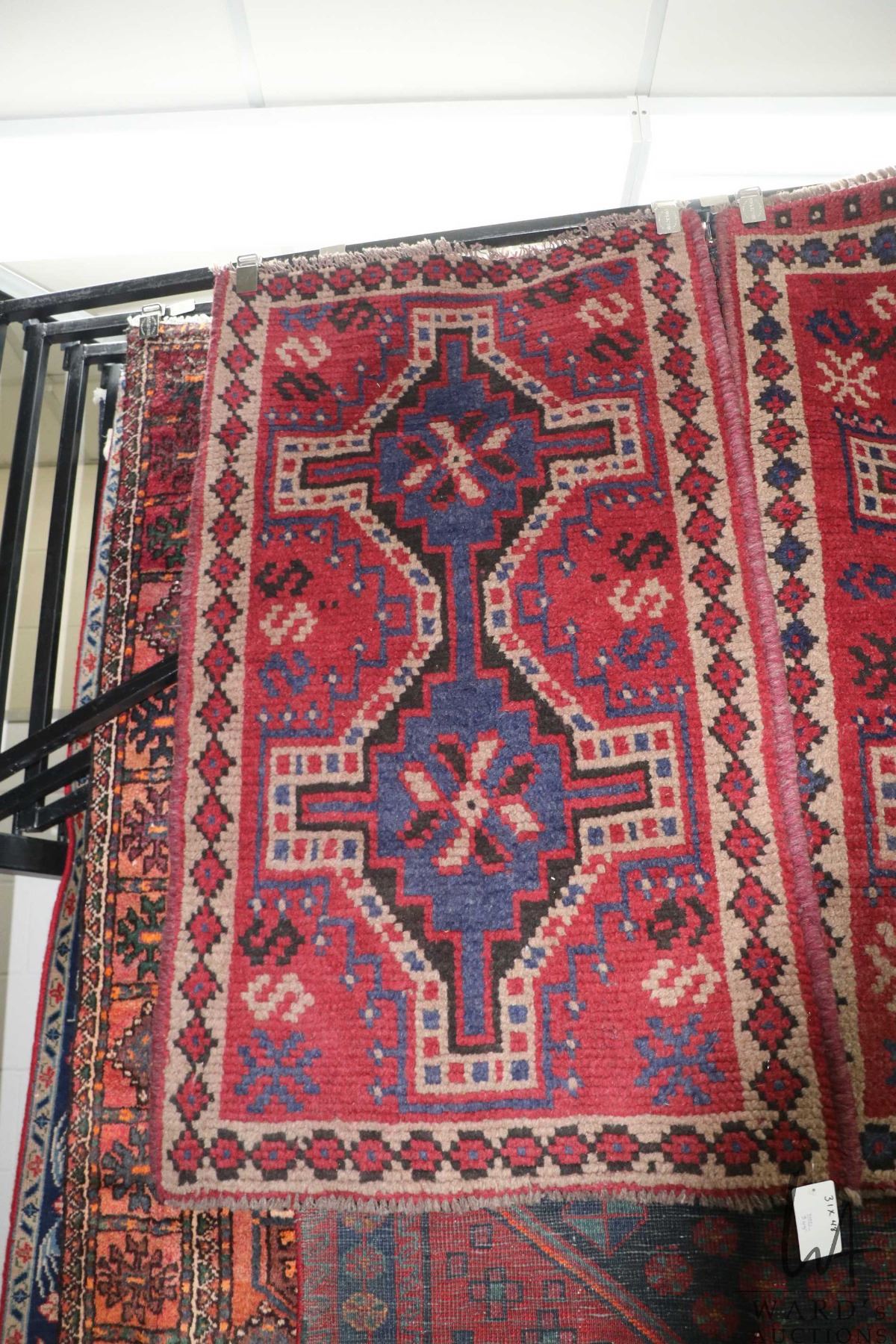 100% handmade Iranian wool scatter rug "Fasa" with double medallion, red background and highlights of blue, brown and taupe, 30" X 48"