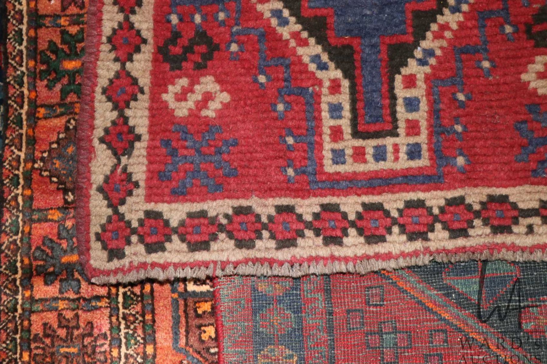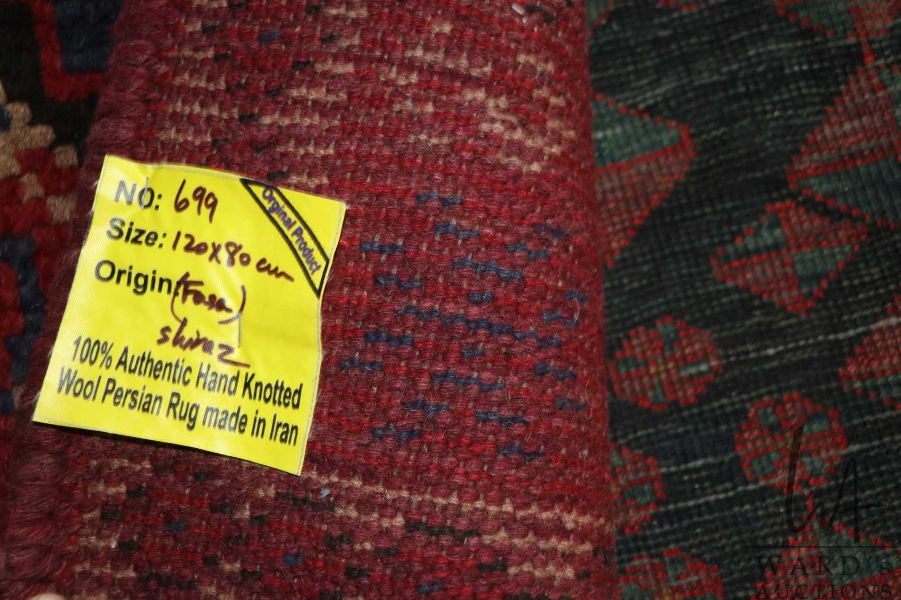 100% handmade Iranian wool scatter rug  Fasa  with double medallion, red background and highlights o