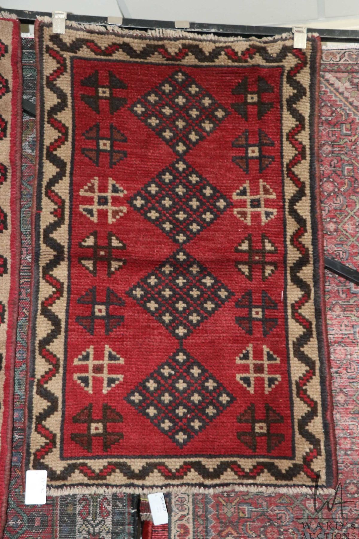 100% handmade Iranian wool throw carpet "Fasa" with quadruple medallion, red background and highlights of taupe, blue and black etc. 28" X 46"