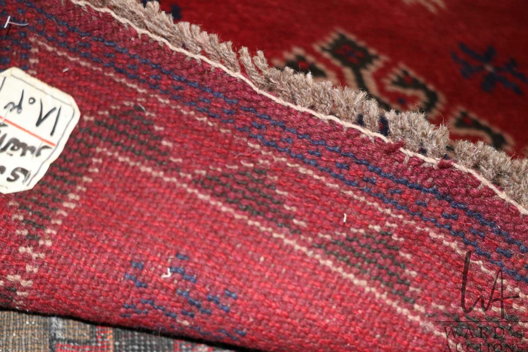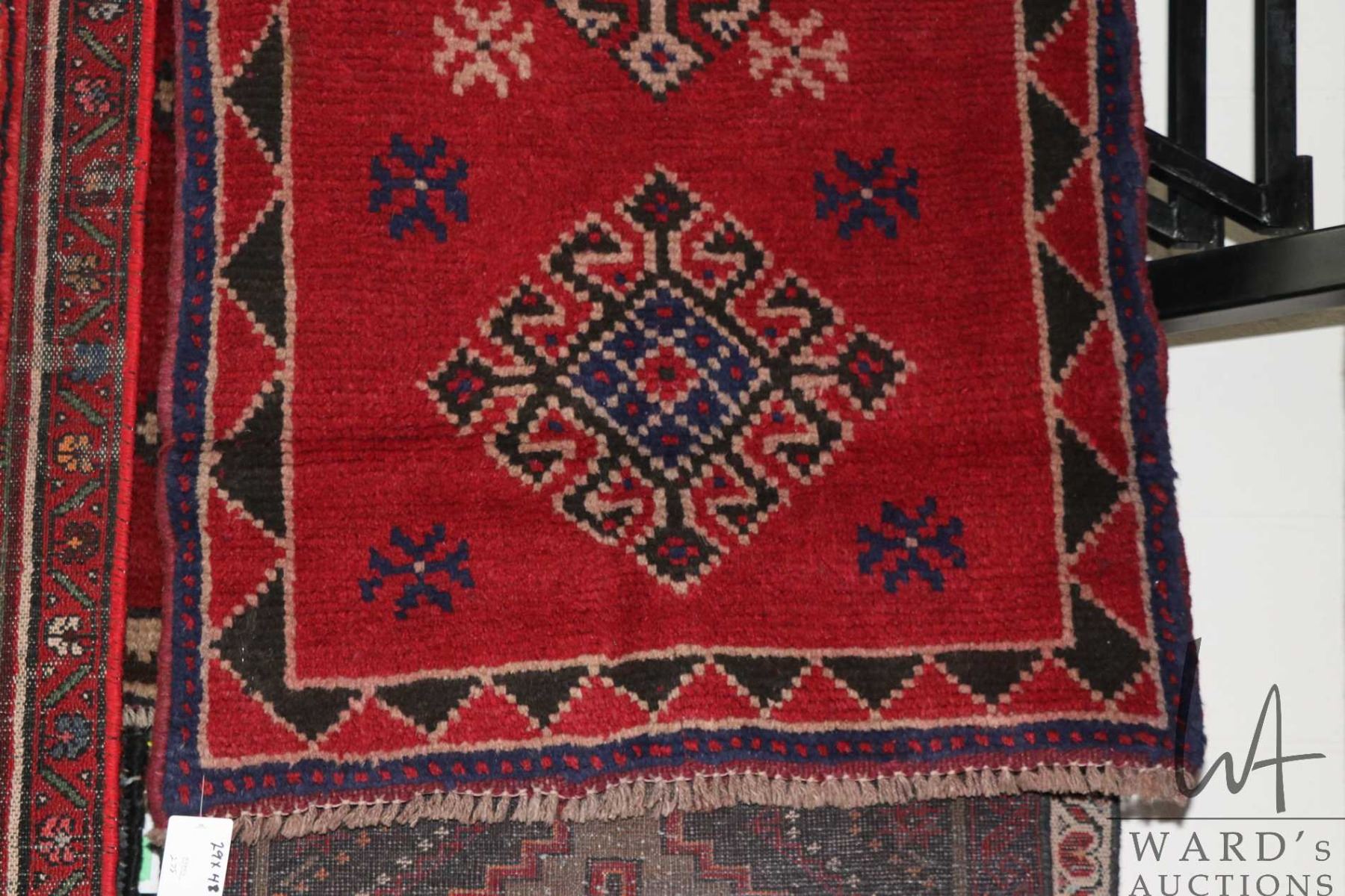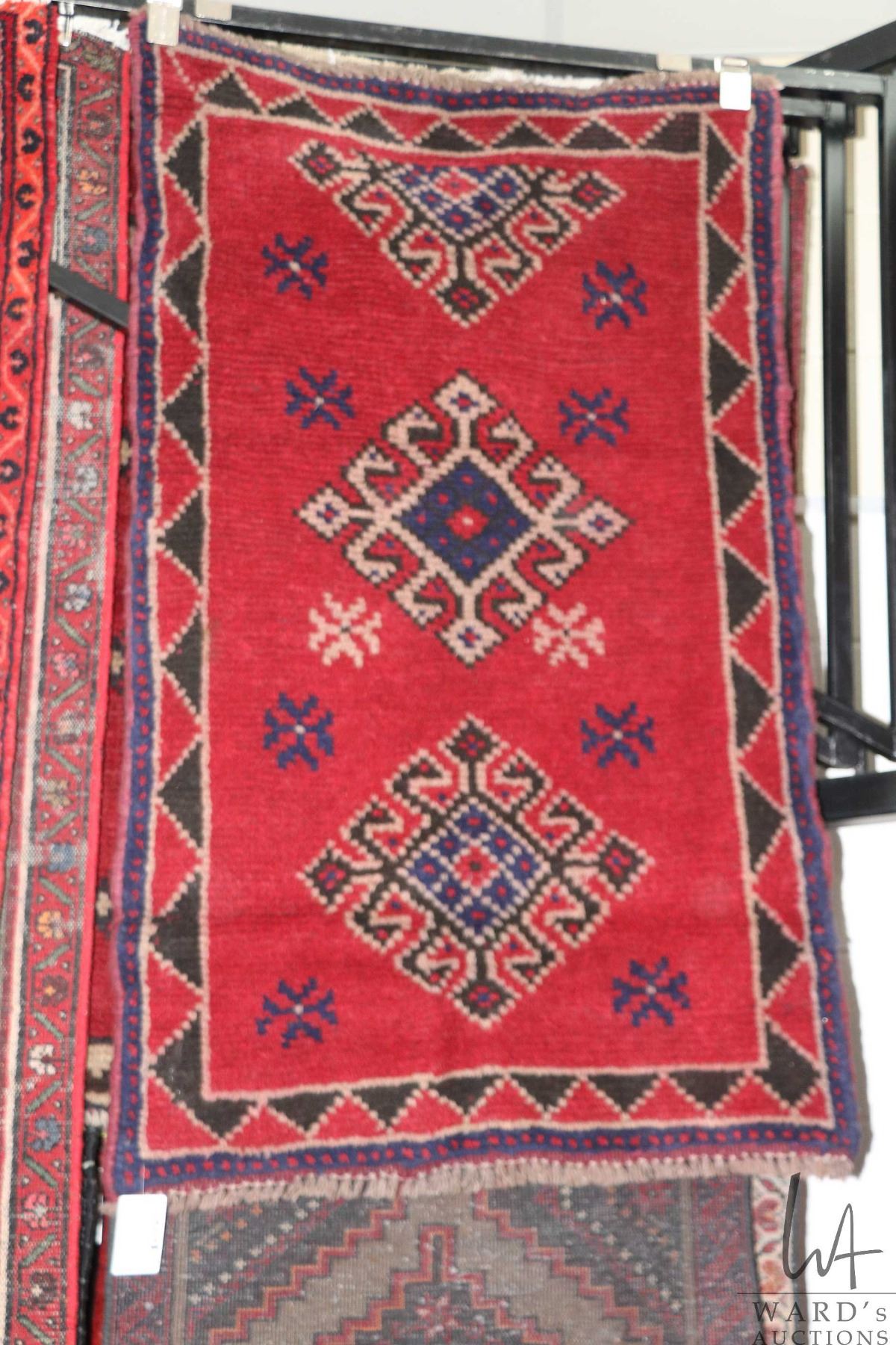 100% handmade Iranian wool throw carpet "Fasa" with triple medallion, red background, and highlights of brown, blue and taupe etc. 29" X 48"