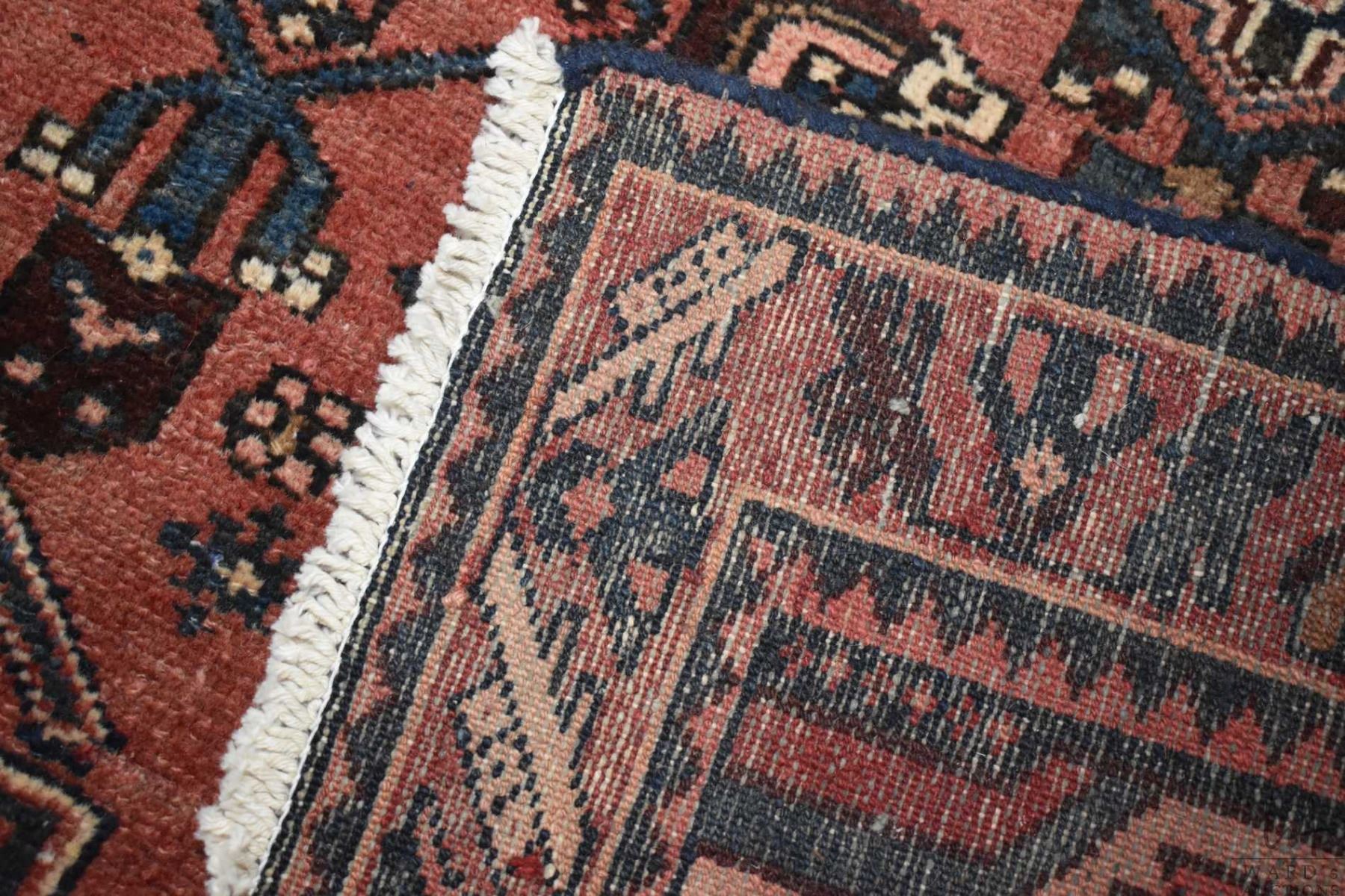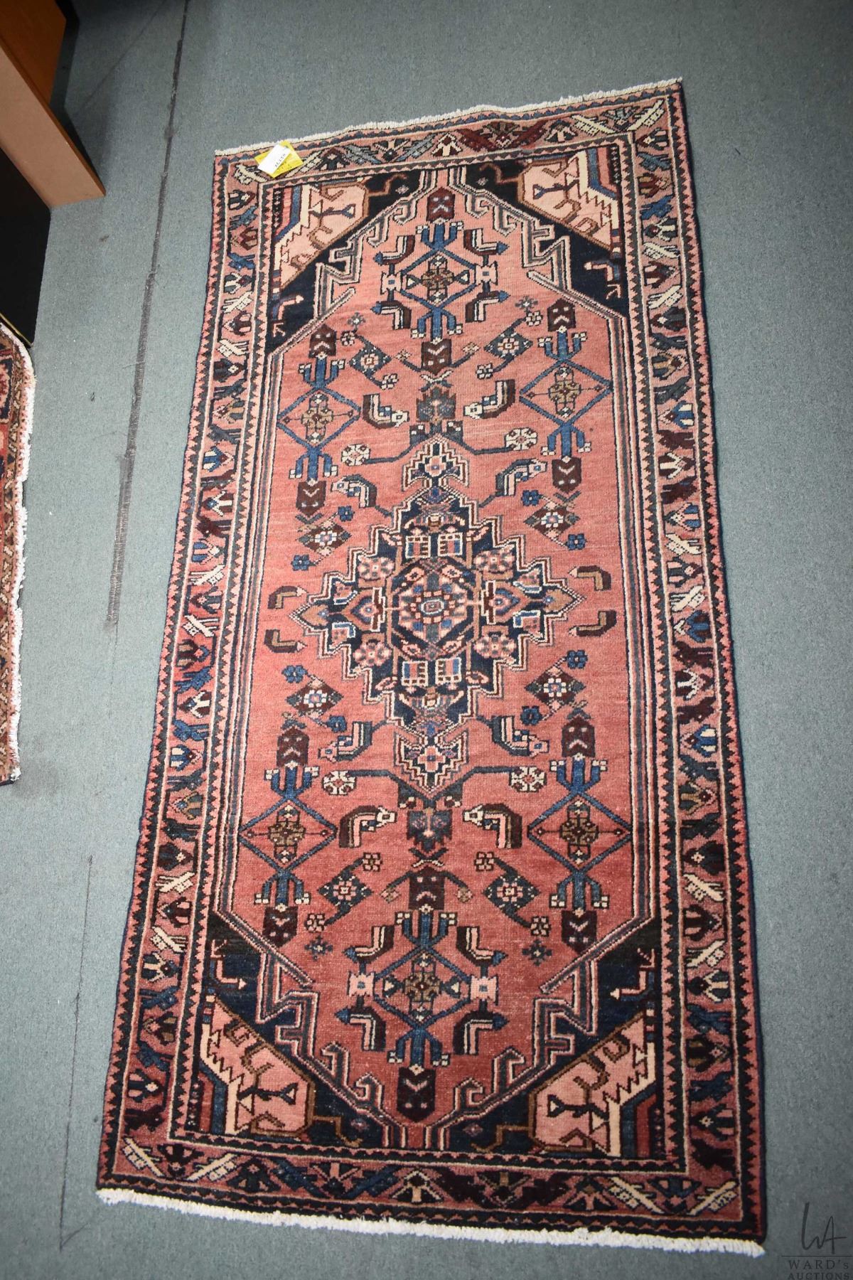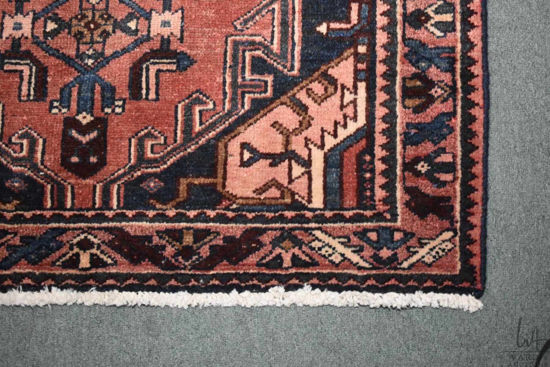100% handmade Saveh wool area carpet with red background, highlights of blue, cream, sage etc. 42" X 84"