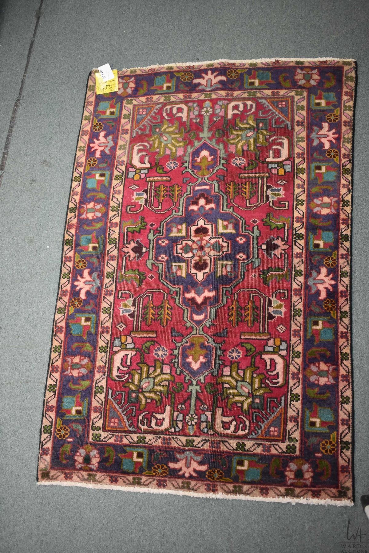 100% handmade Tabriz throw rug with pink background, center medallion and highlights of green, sage, blue etc. 37" X 60"