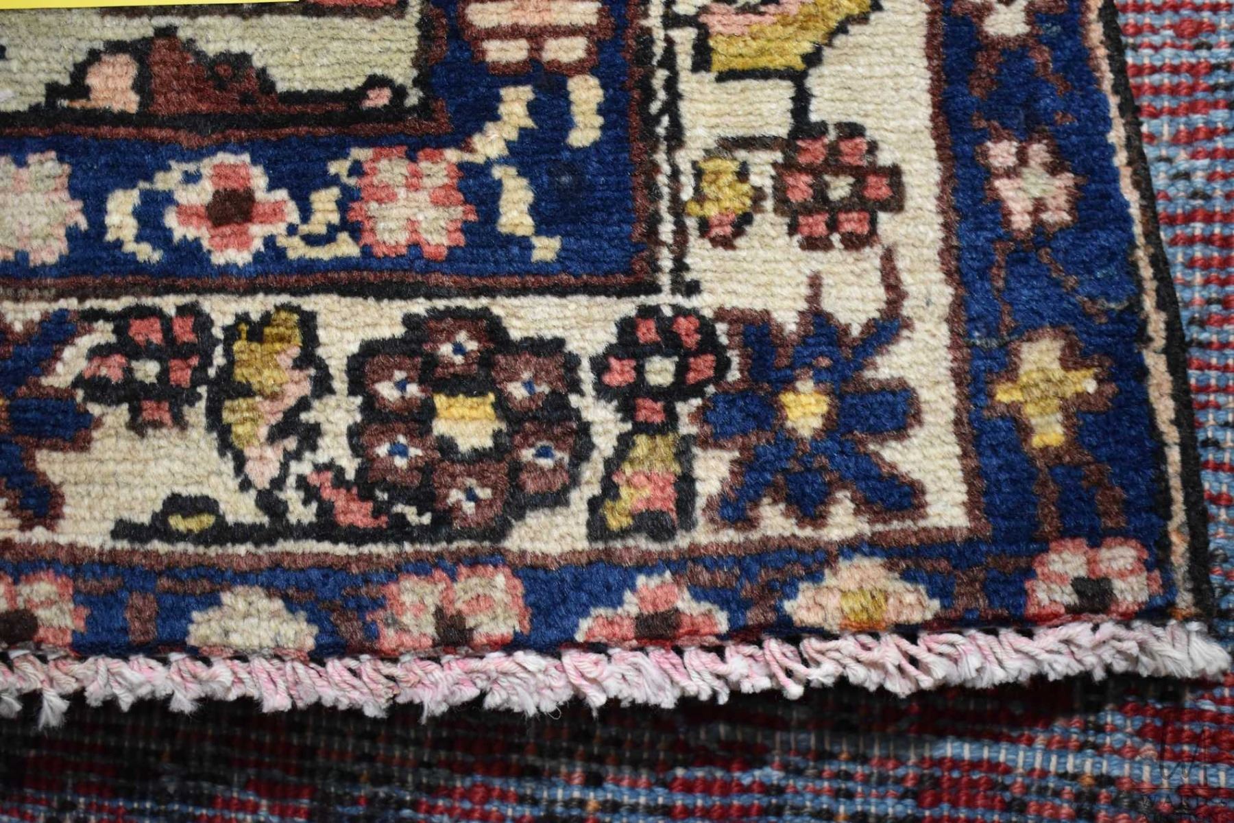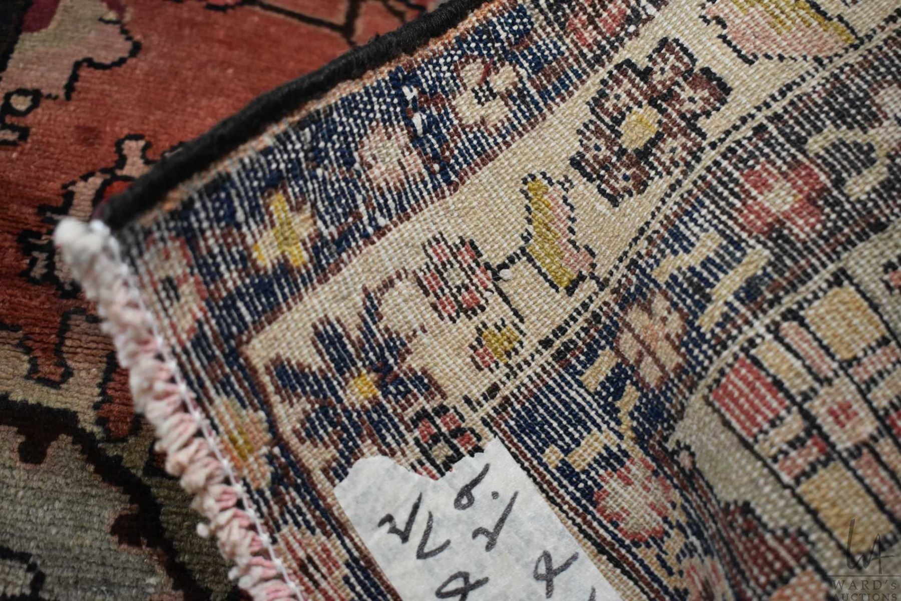 100% handmade Tafresh area carpet with center medallion, stylized floral design and red background, highlights of blue, cream, sage etc. 33" X 49"
