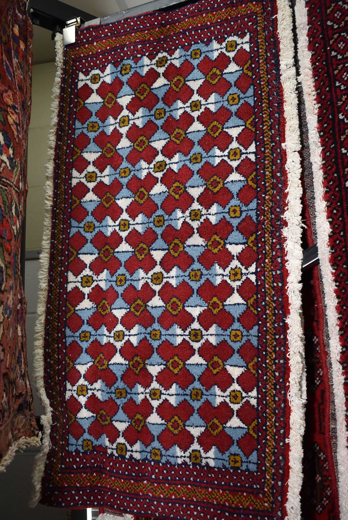 100% handmade scatter rug in tones of red, blues, taupe etc. 38" X 19"