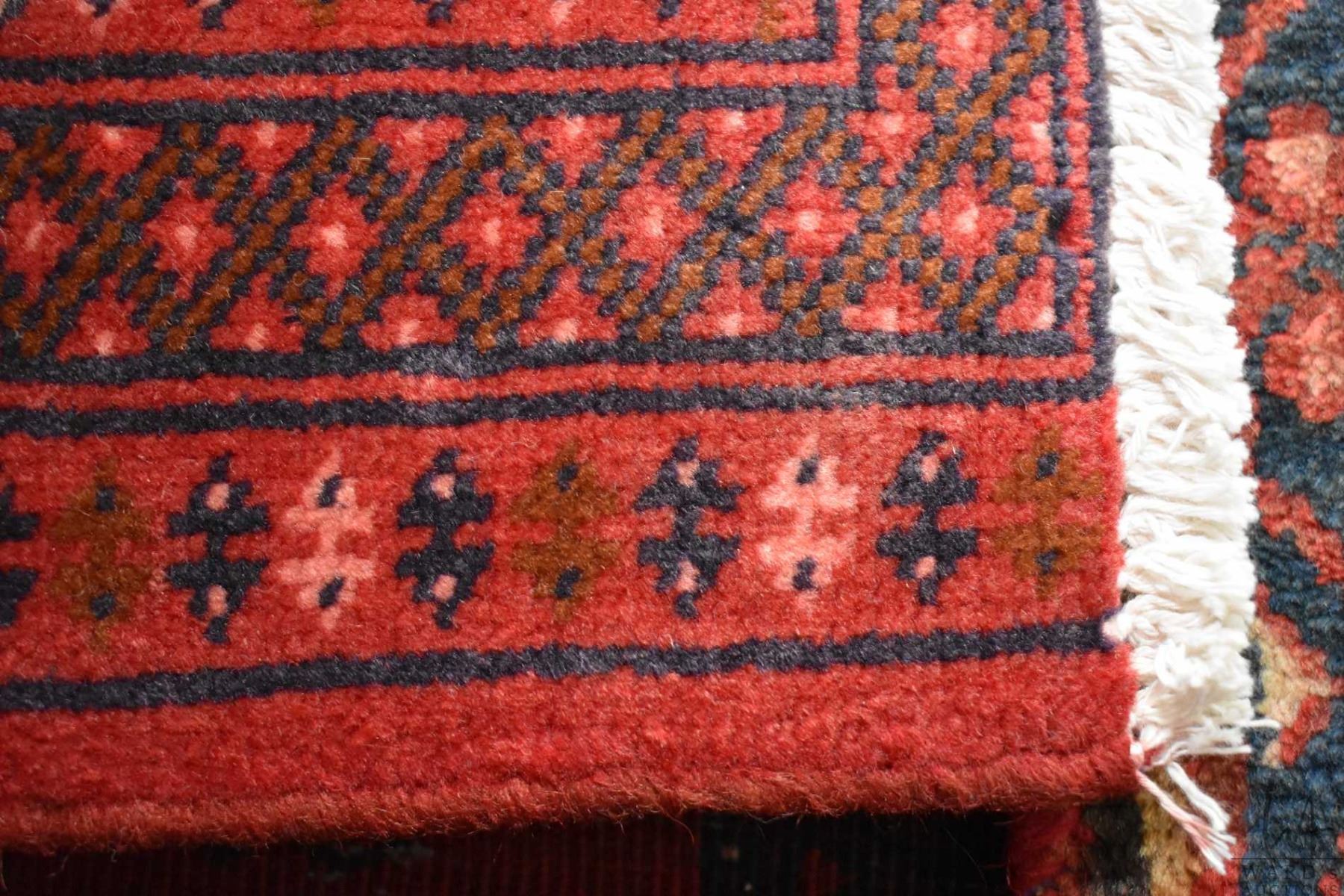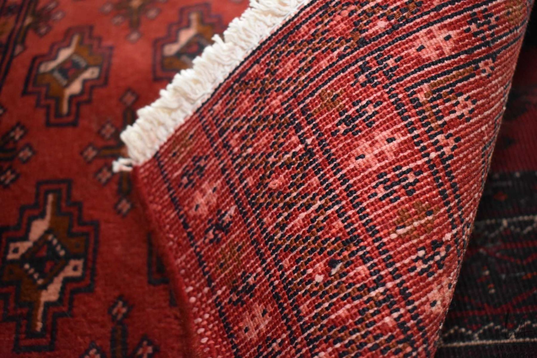 100% handmade scatter rug with red background and geometric design with highlights of pink, blue etc. 20" X 40"