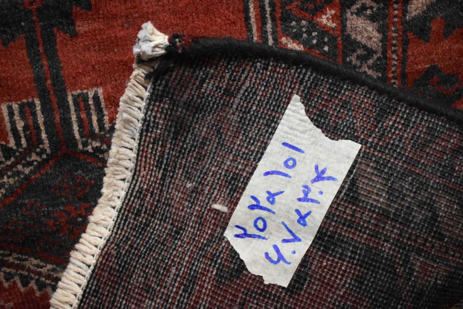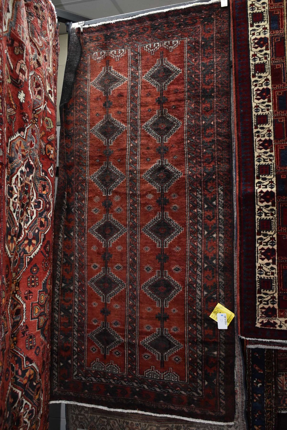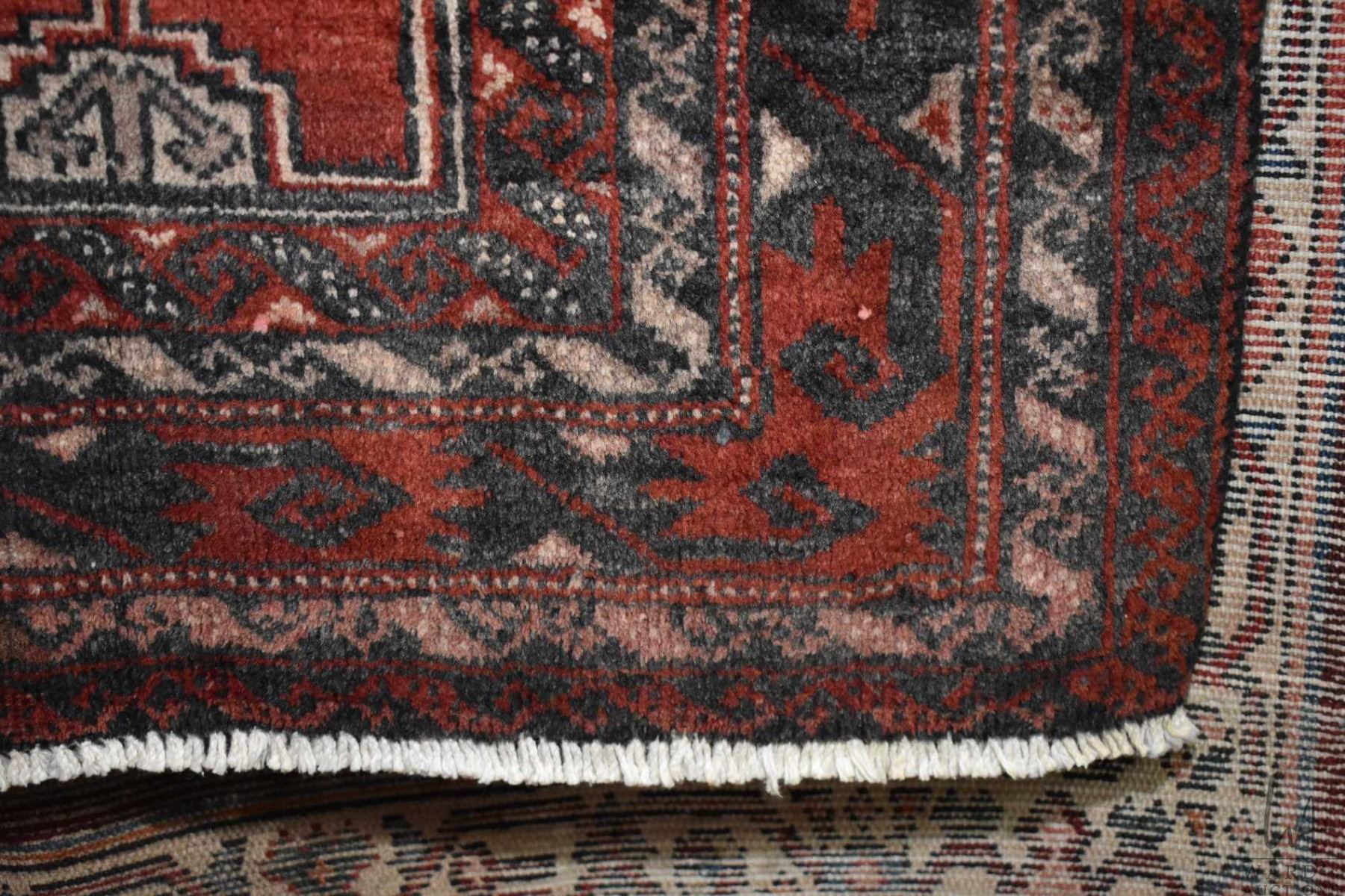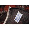 100% handmade wool carpet Baluchi with overall geometric design, red background and multiple borders, highlights of blue, mauve etc. 39" X 80"