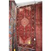 100% handmade wool carpet Hamdan with center medallion, red background, stylized floral and highlights of tan, orange, blue etc. 41" X 79"