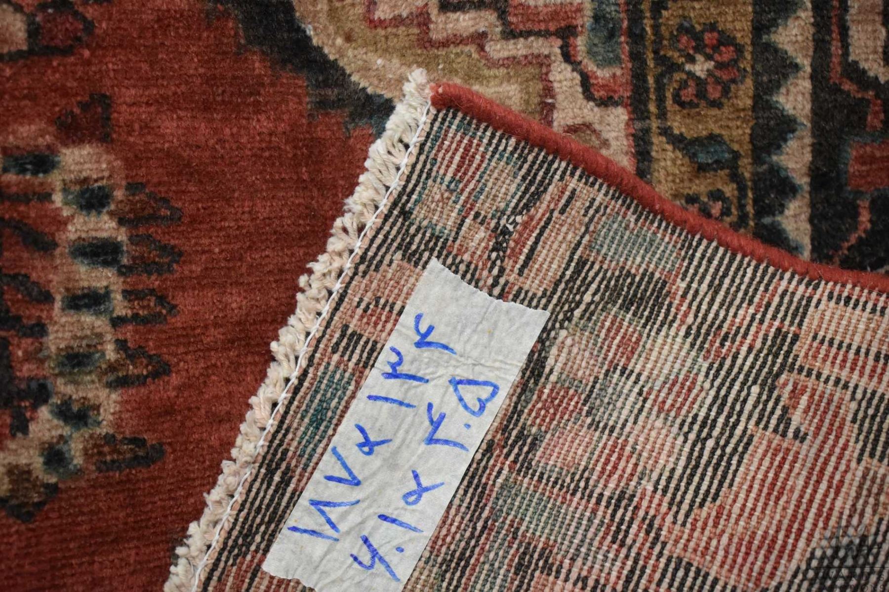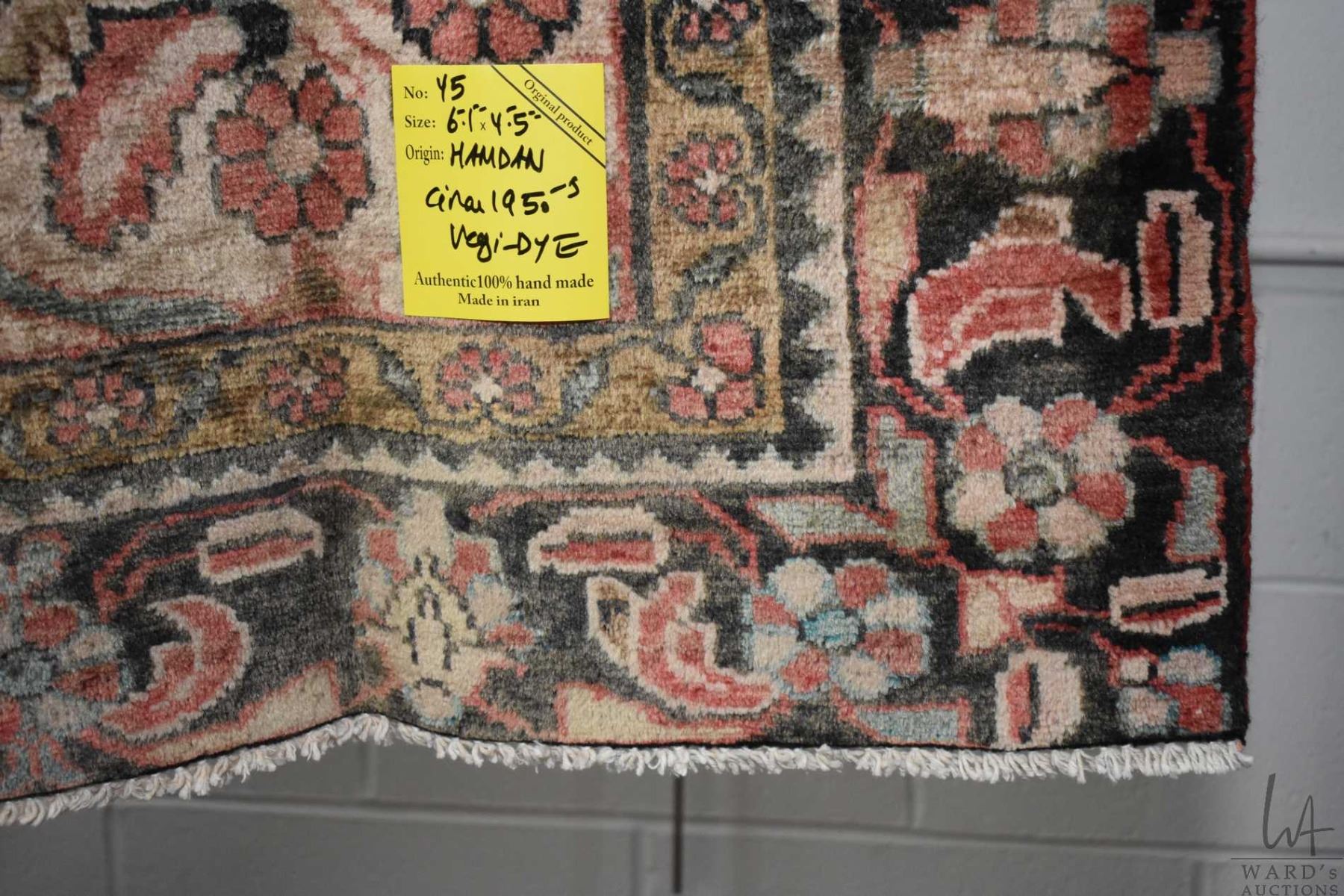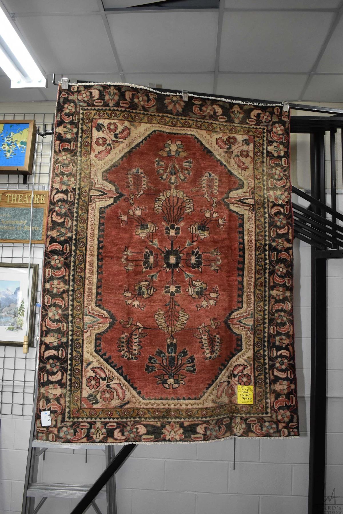 100% handmade wool carpet Hamdan with floral design, red background and highlights of gold, cream etc. 53" X 73"