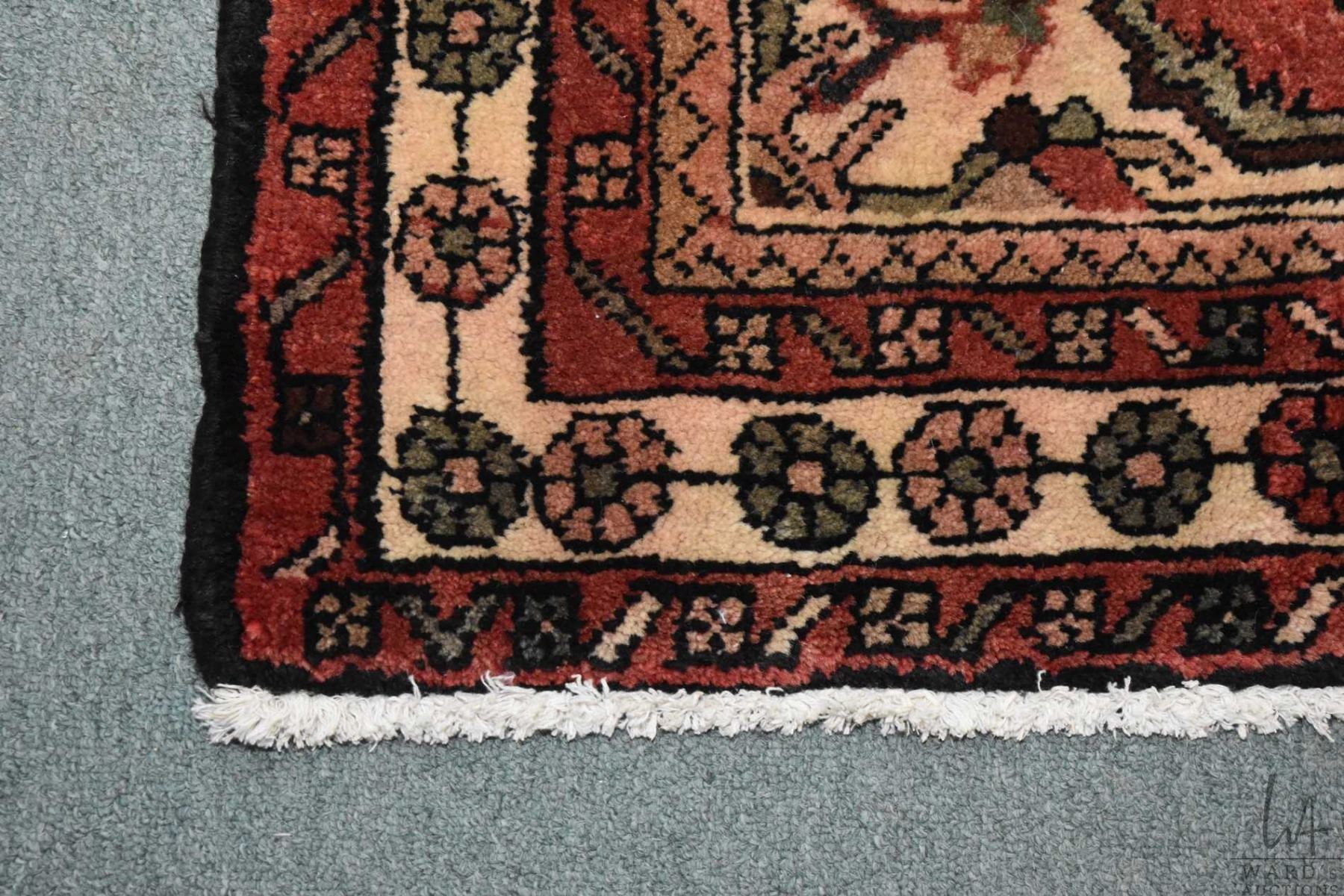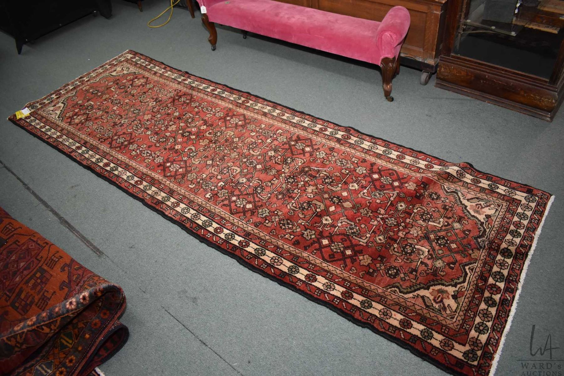 100% handmade wool carpet runner Hossien Abad with overall geometric design, red background and highlights of green, pink, cream etc. 40" X 125"