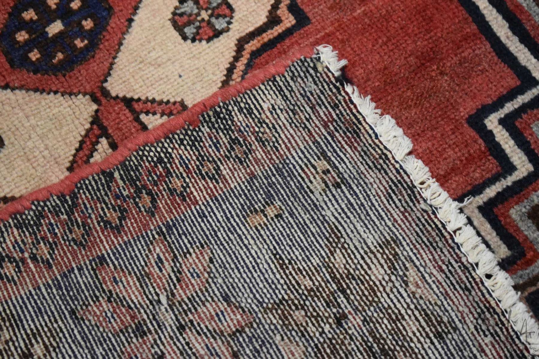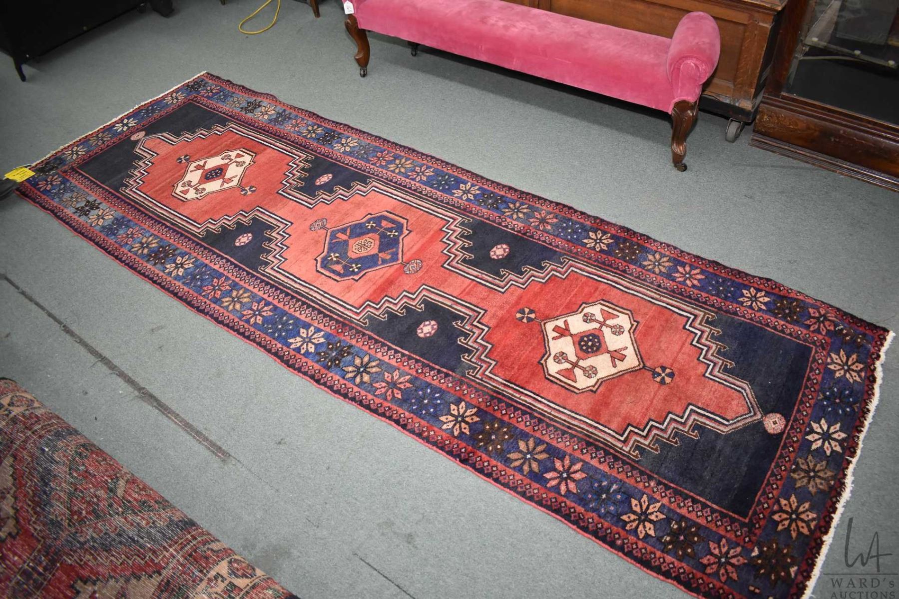 100% handmade wool carpet runner Sabeh with triple medallion, red background in shades of blue, cream, tan etc. 40" X 122"