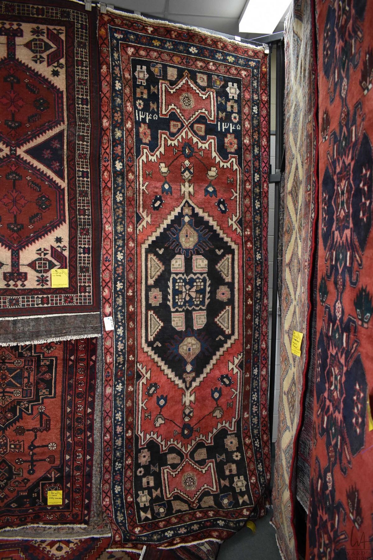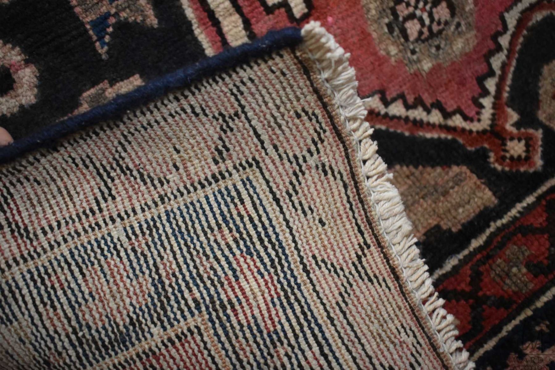 100% handmade wool carpet runner with center medallion and red background, highlights of blues, cream, pink etc. 43" X 120"