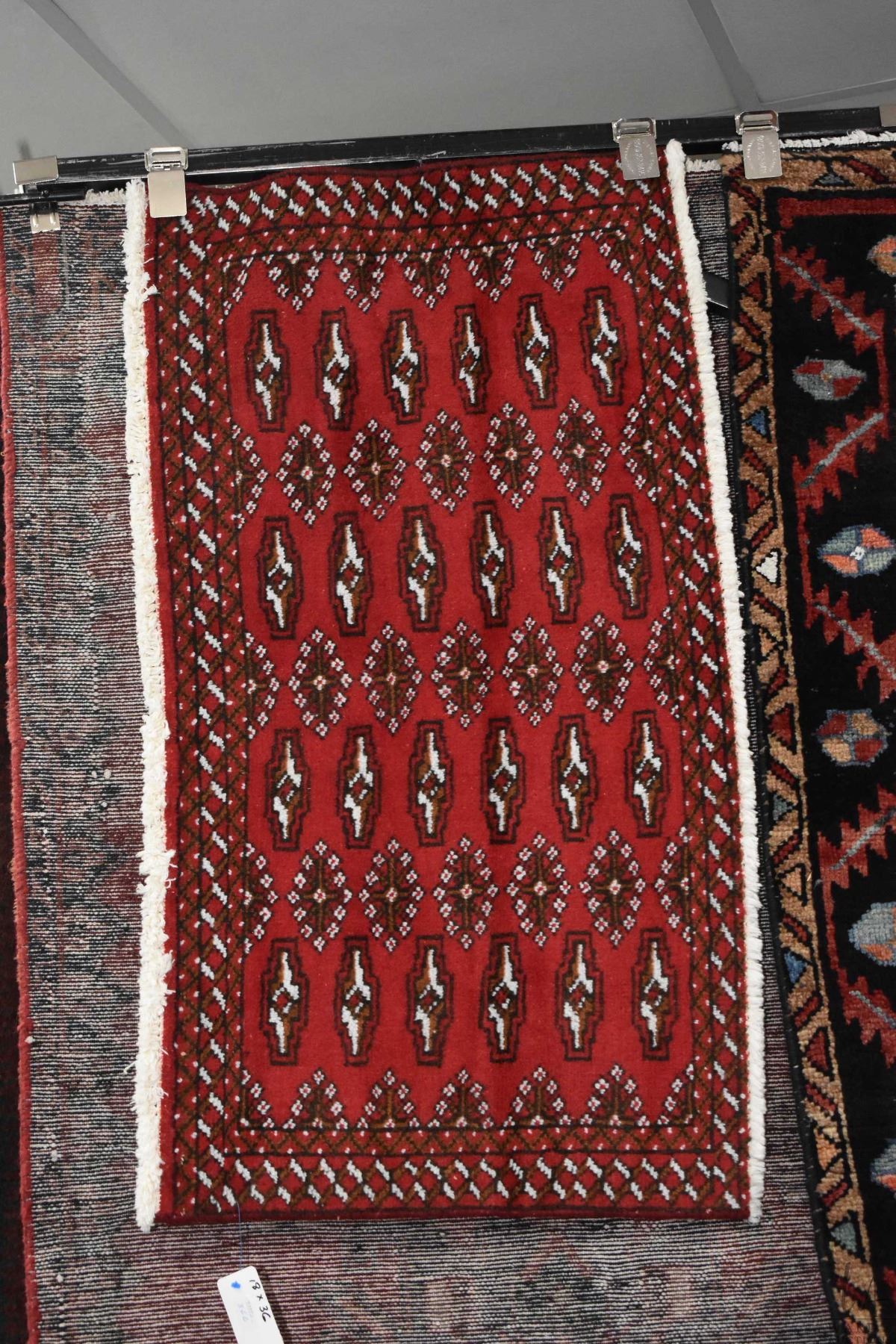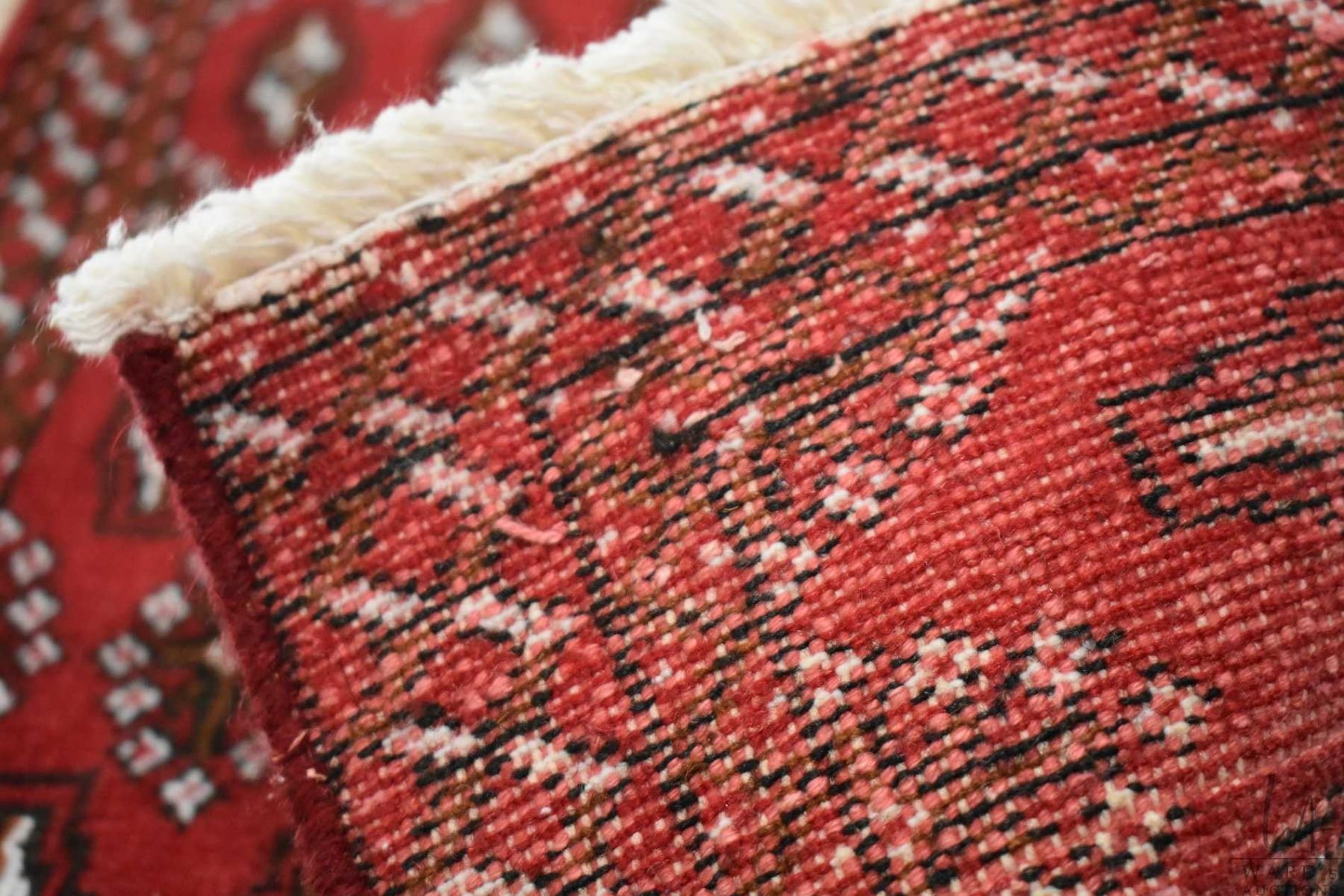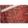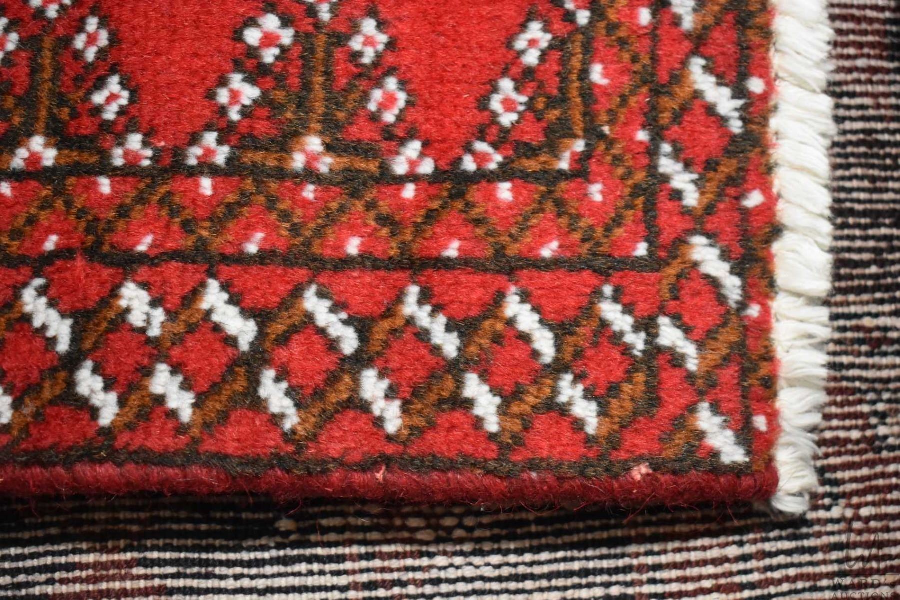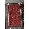 100% handmade wool scatter rug with red background, overall geometric design and highlights of cream and tan, 18" X 36"