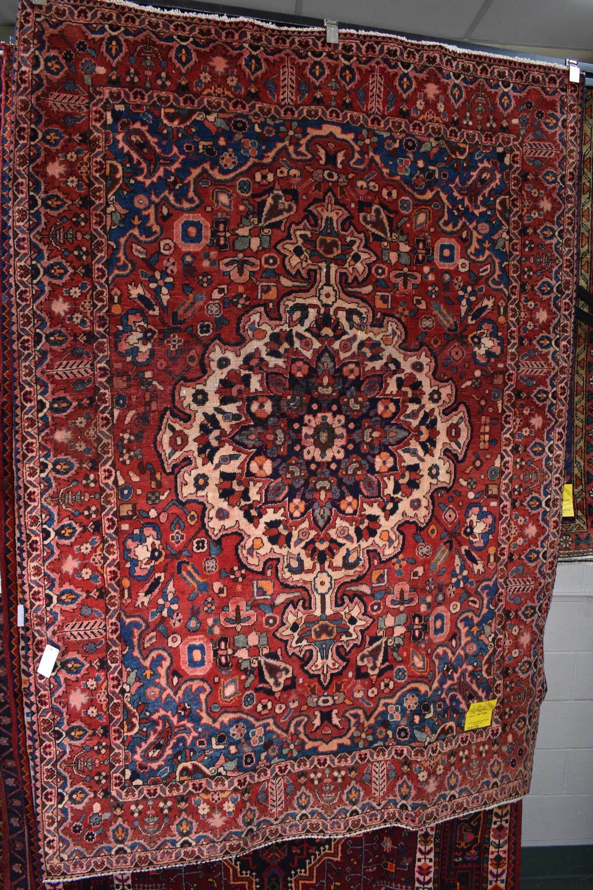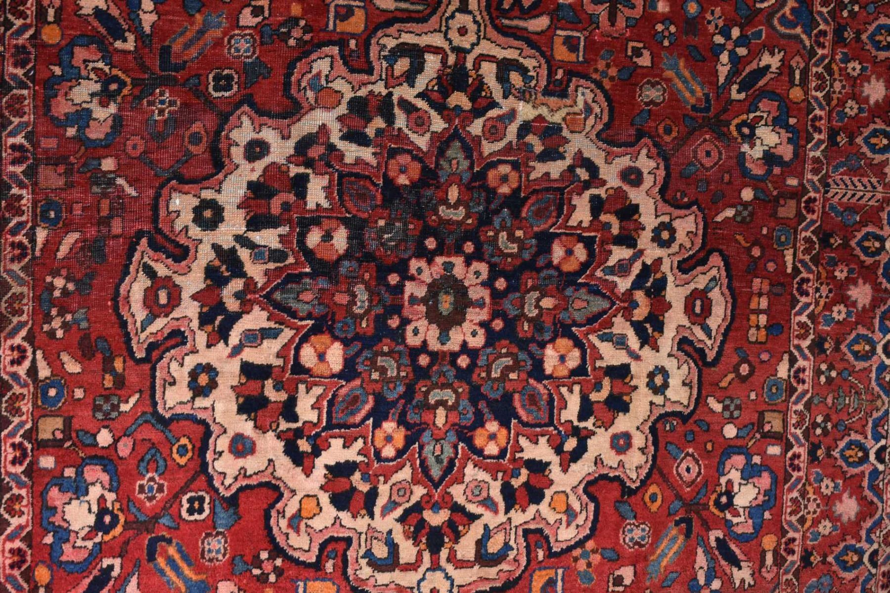 100% wool Iranian Bakhtiar area carpet with large center medallion with predominantly red background and highlights of navy and pale blue, cream etc. 63" X 89"