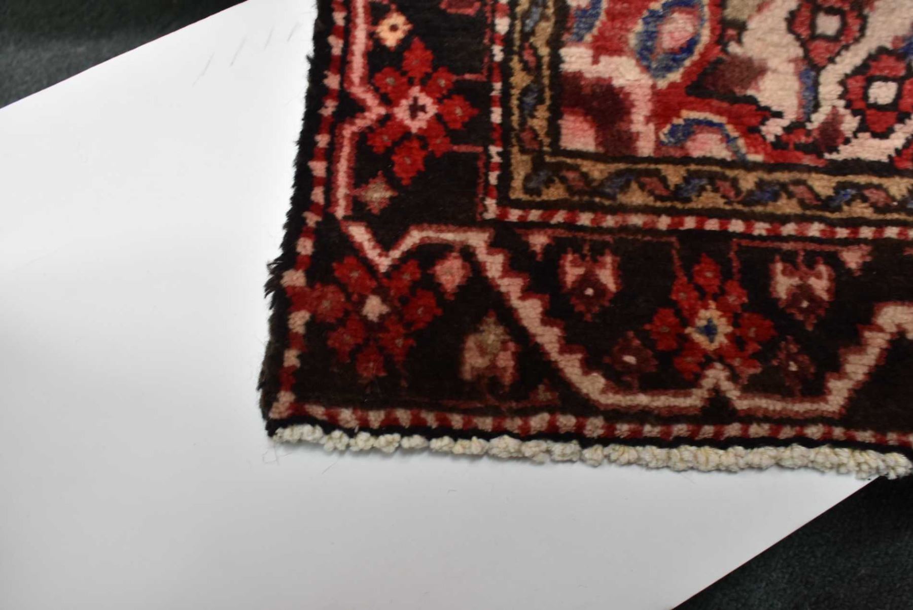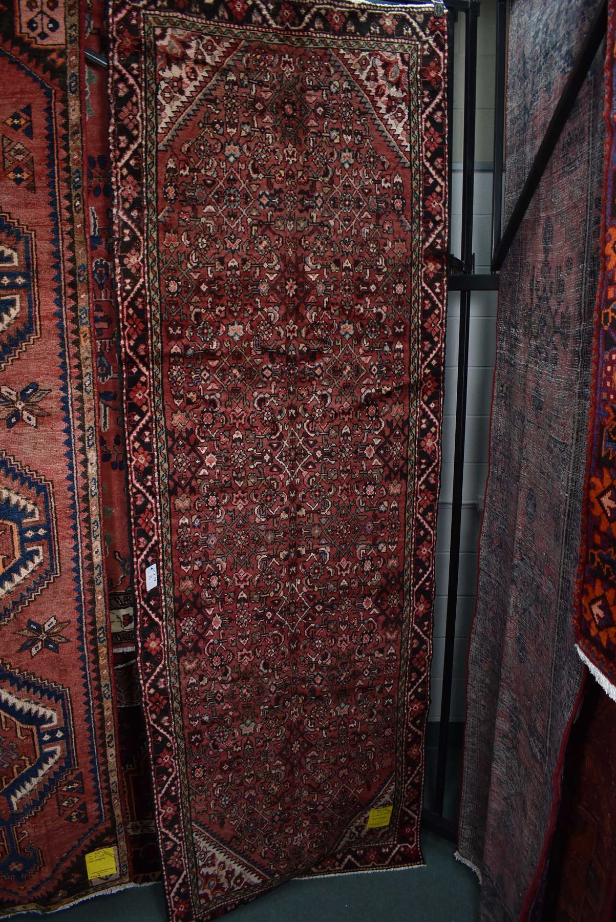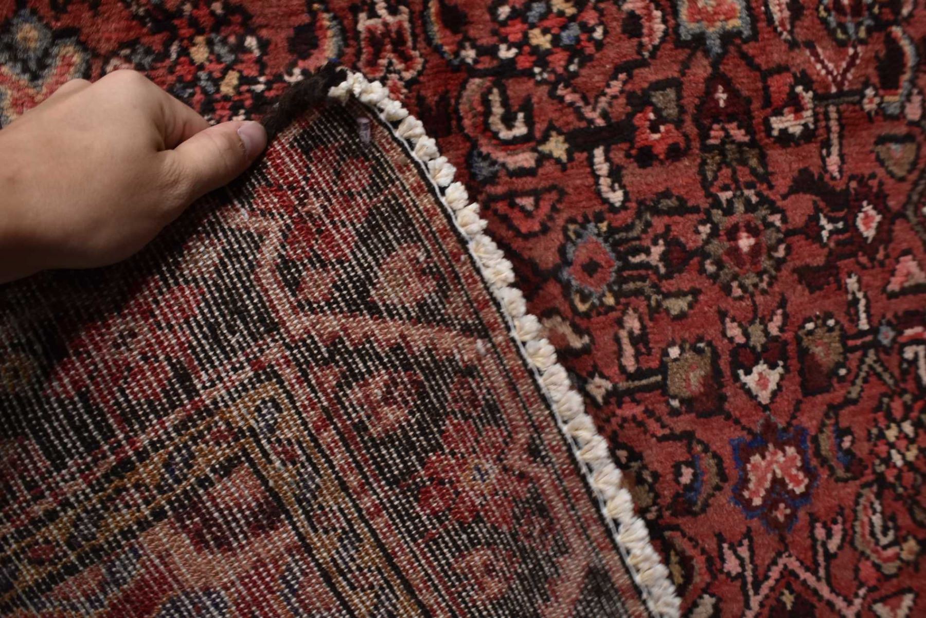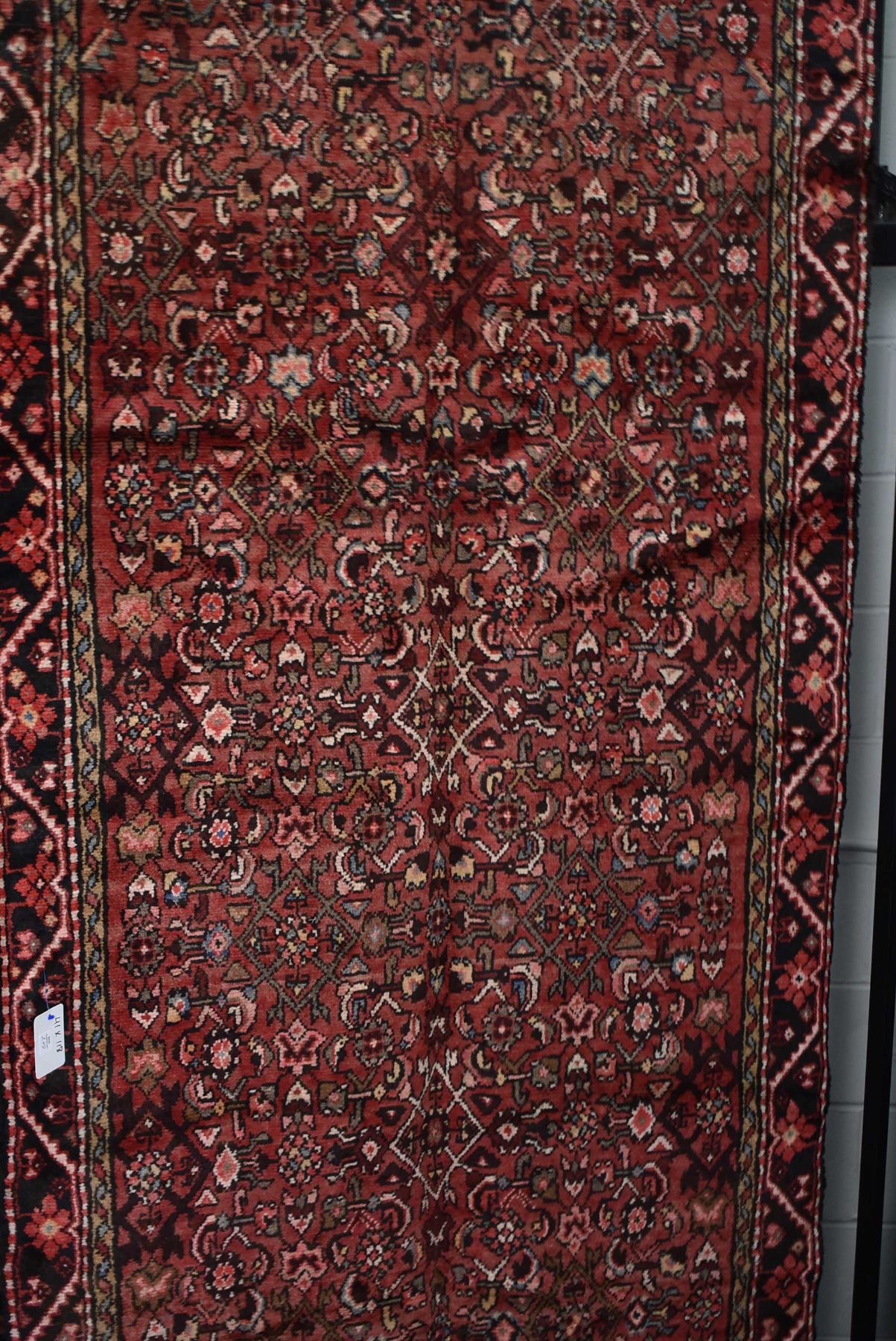 100% wool Iranian Hosseinabad runner/ area carpet with geometric floral pattern with red background and highlights of taupe, cream, pink etc. 41" X 118"
