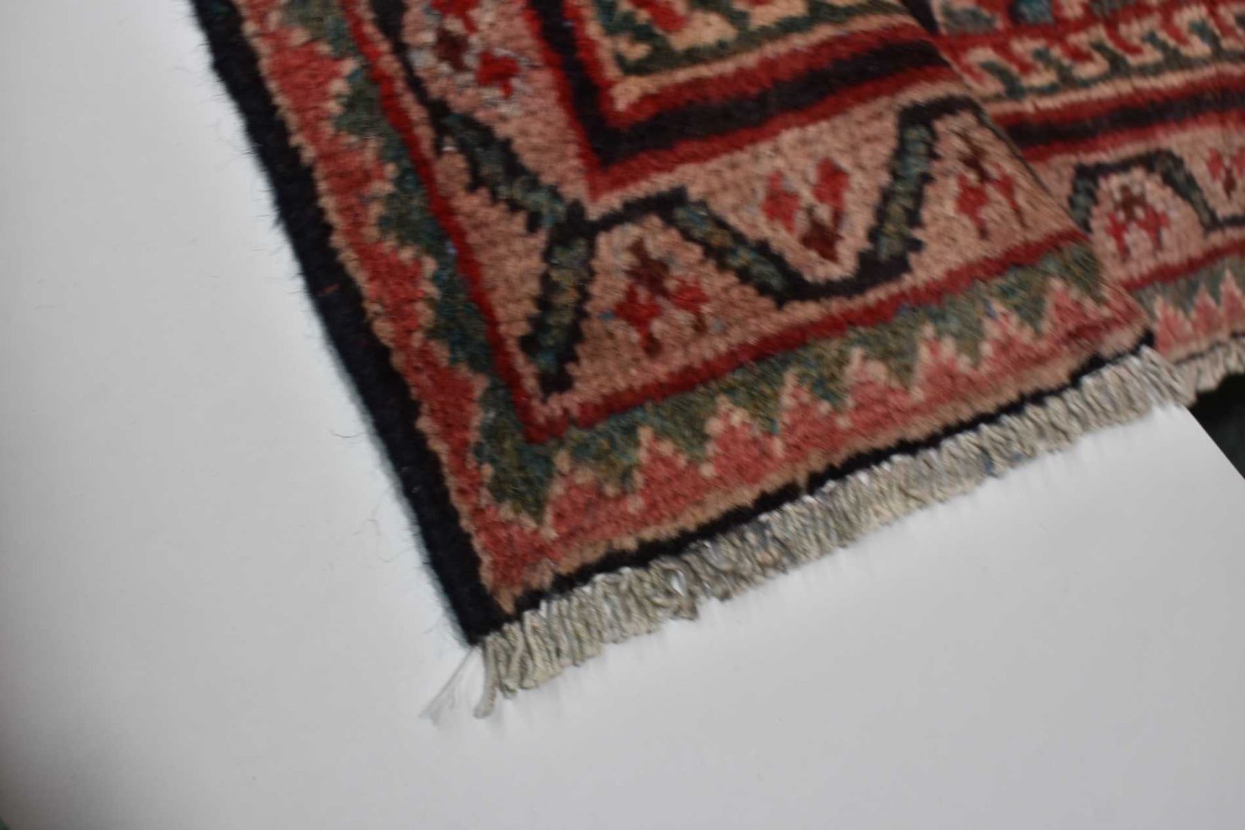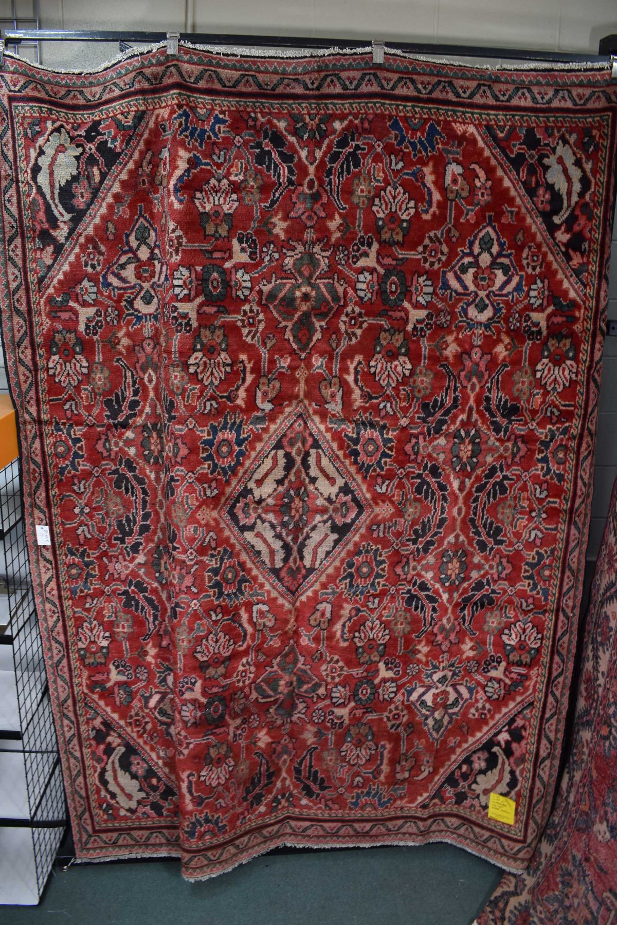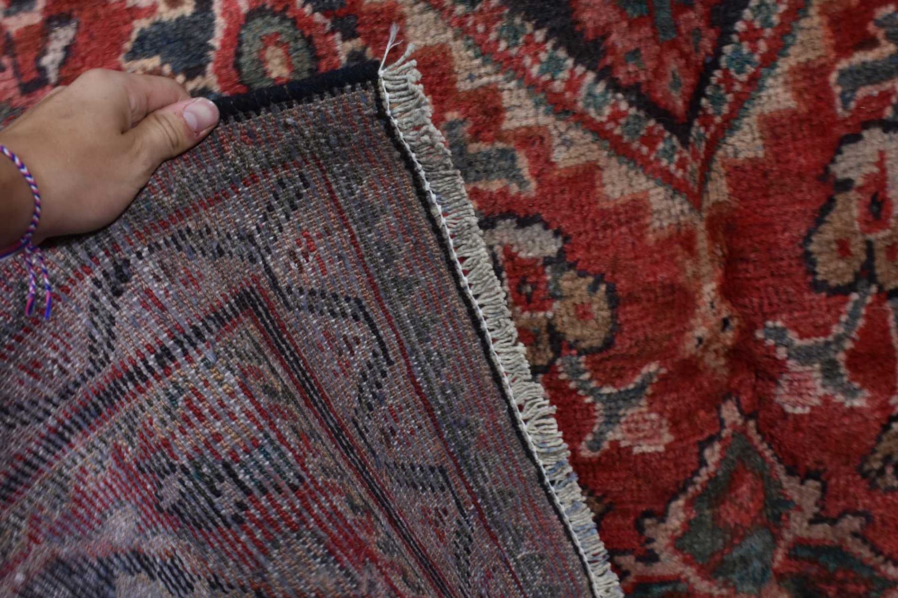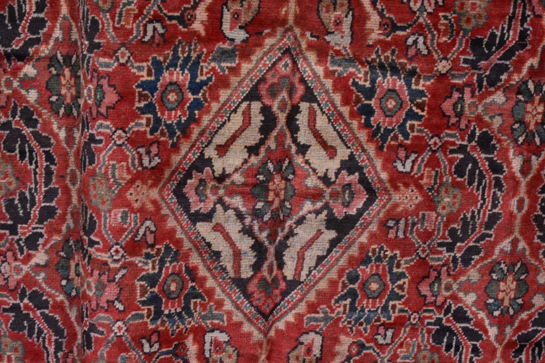100% wool Iranian Meshkabad area carpet with diamond center medallion, overall floral motif, red background with shades of blue, cream and copper highlights, 85" X 115"