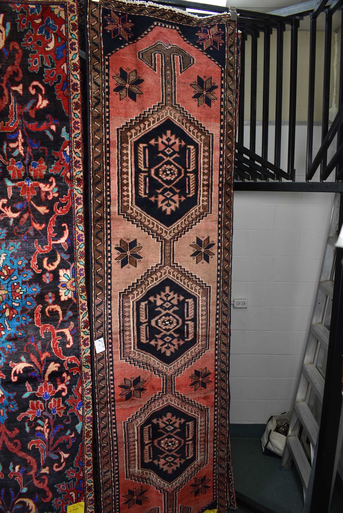 100% wool Iranian Zanjan runner/ area carpet with triple medallion, red background, highlights of taupe, royal blue, cream etc. 30" X 108"