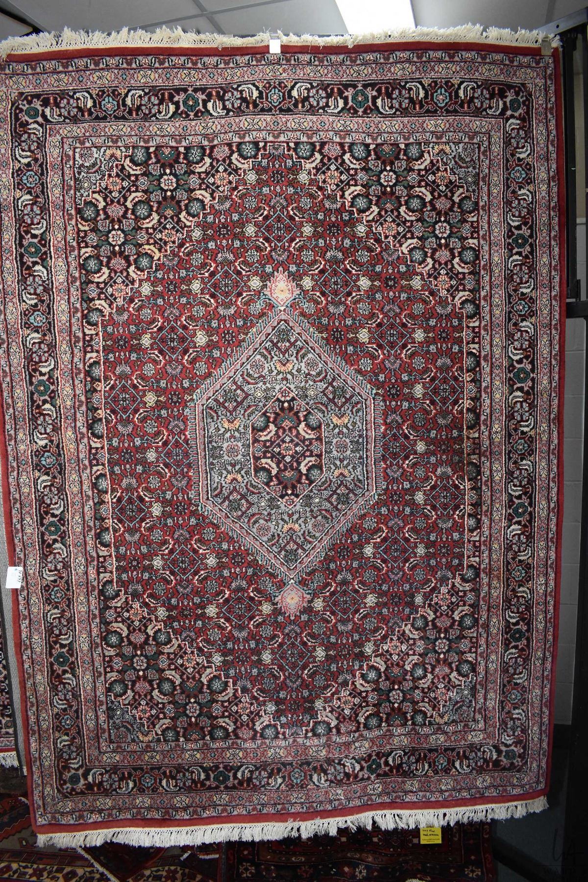 100% wool area carpet with center medallion, red background and overall geometric floral design with highlights of blue, purple, green etc. 70" X 97"