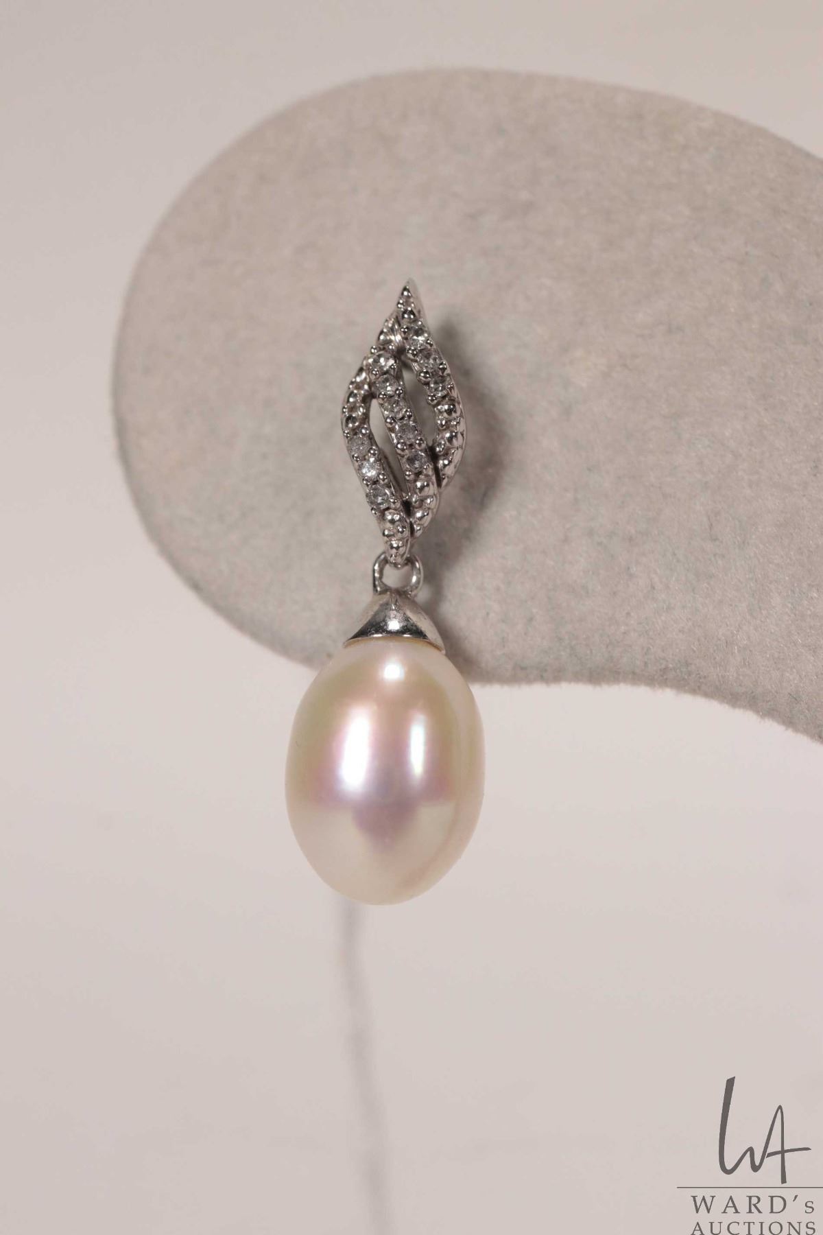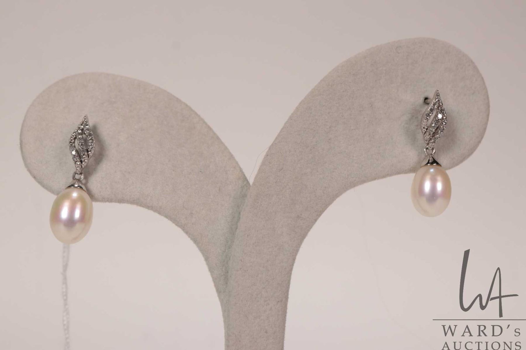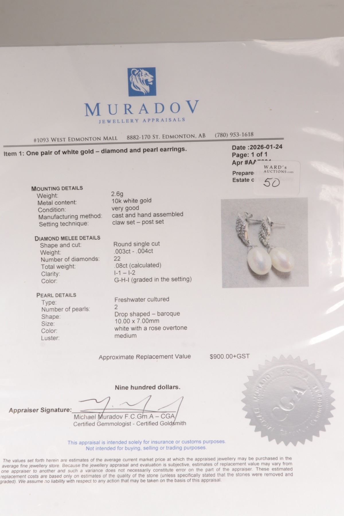 10kt white gold and fresh water cultured pearl earring set with single cut round diamonds. Retail replacement value $900.00