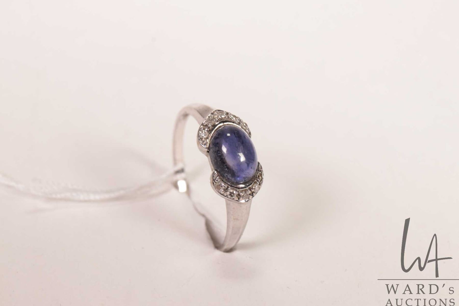 10kt white gold, cabochon amethyst and diamond gemstone ring, size 8.75 note: missing one diamond