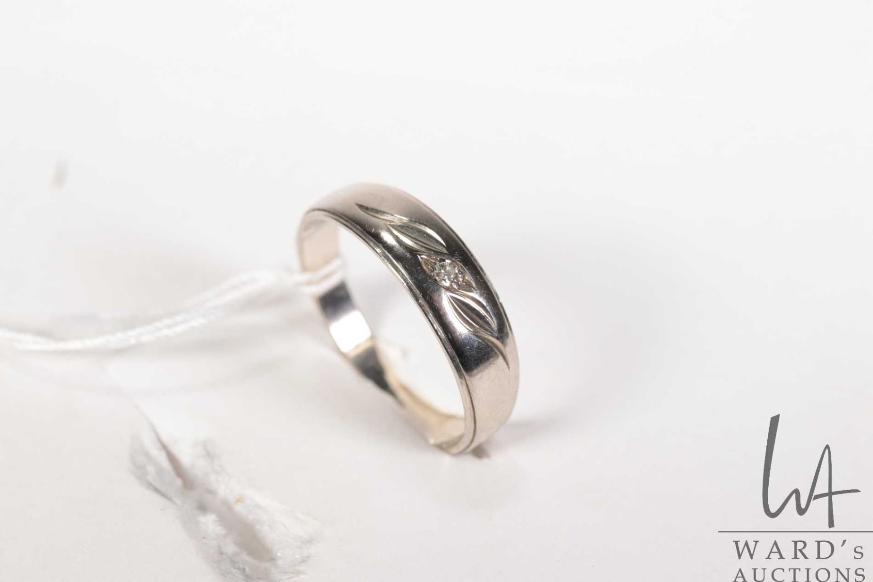 10kt white gold, engraved ring set with single center diamond gemstone, size 8