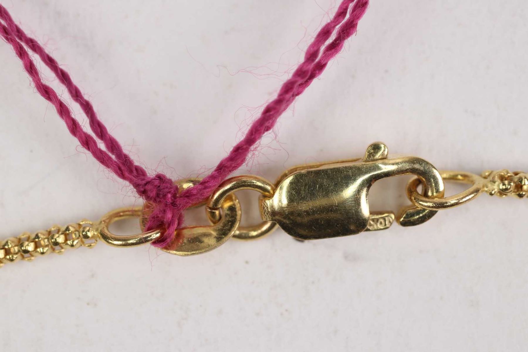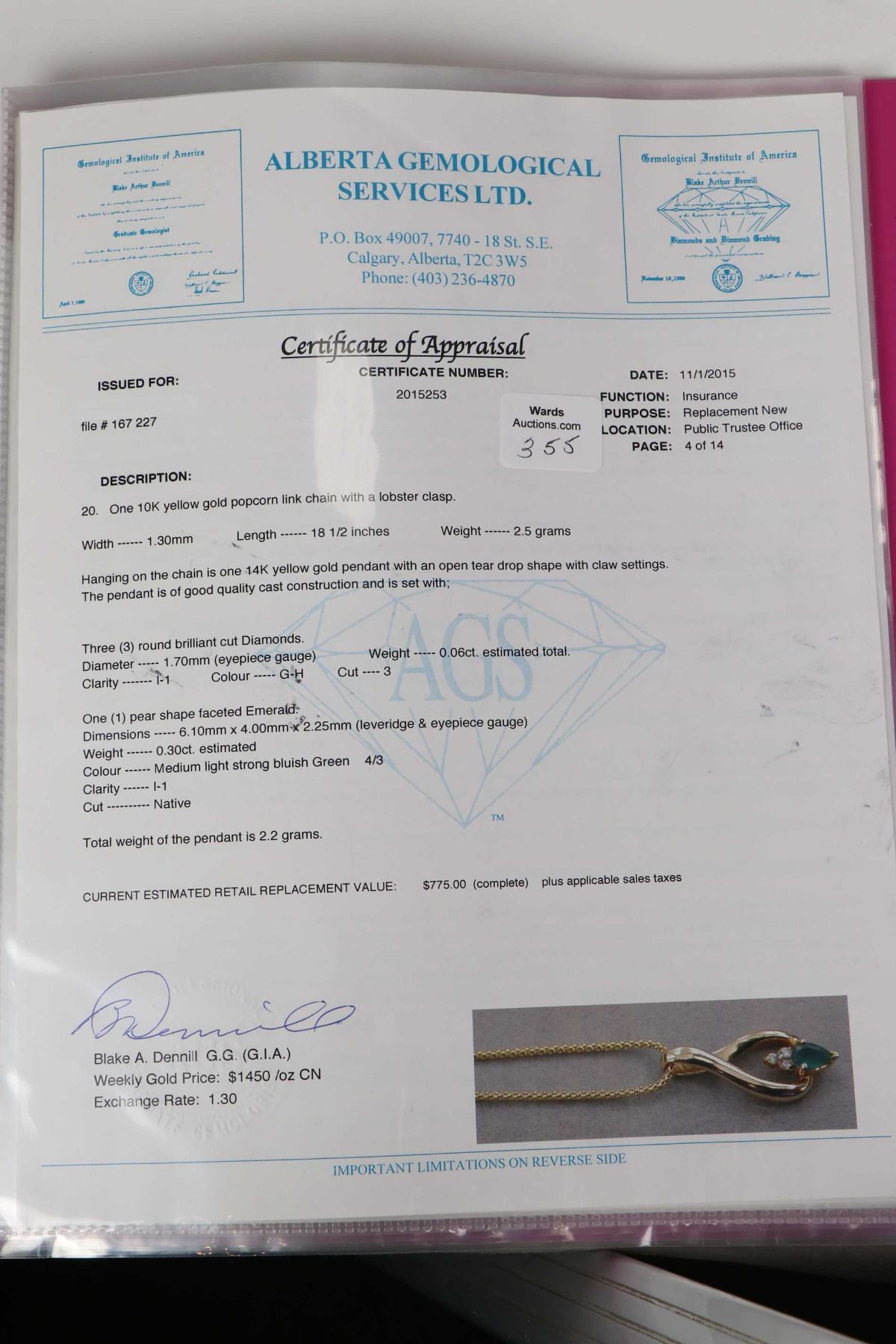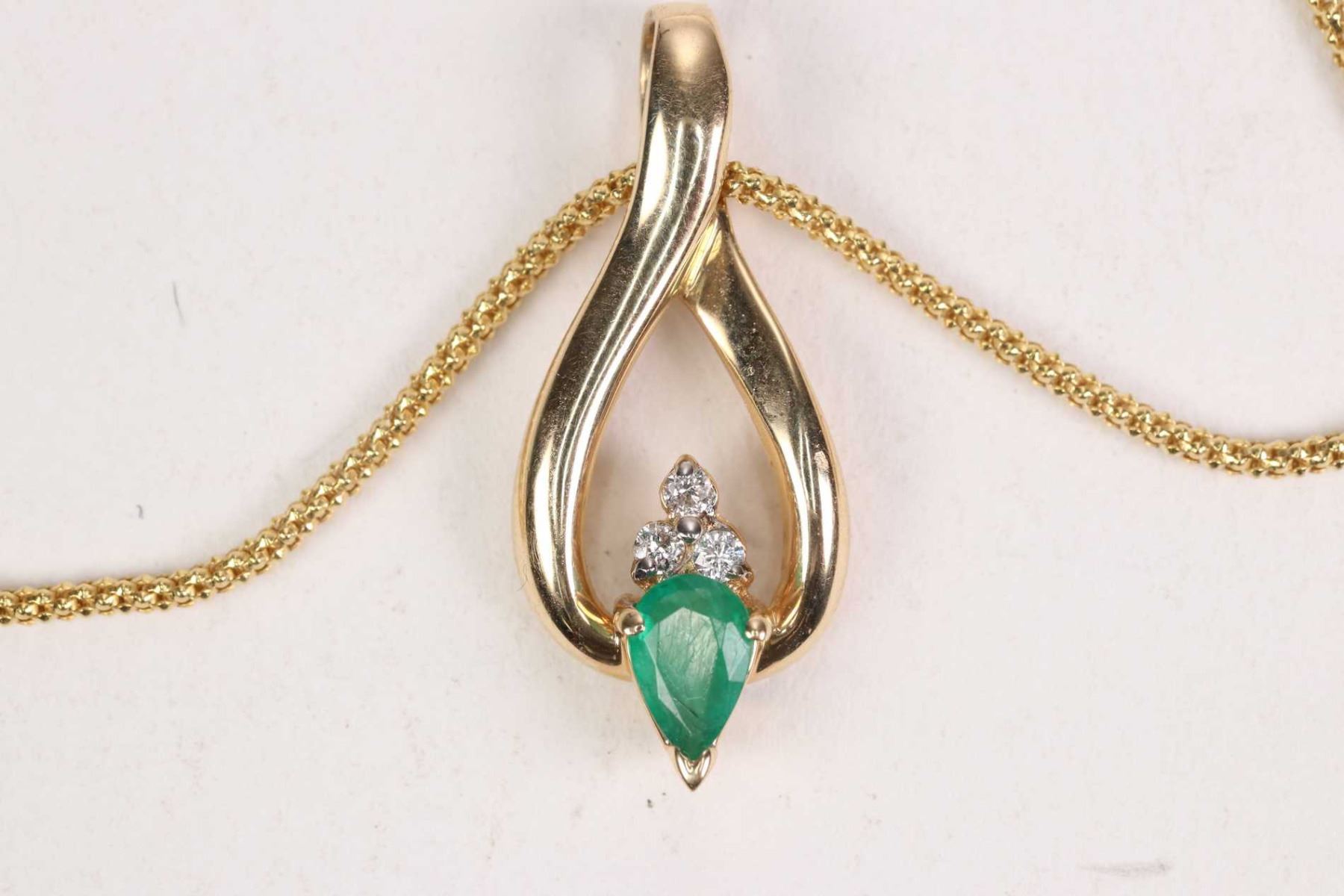 10kt yellow gold 18 1/2" neck chain with a 14kt yellow gold, emerald and diamond pendant set with 0.06ct of brilliant cut white accent diamonds and pear shaped 0.30ct emerald gemstone. Retail replacement value $ 775.00