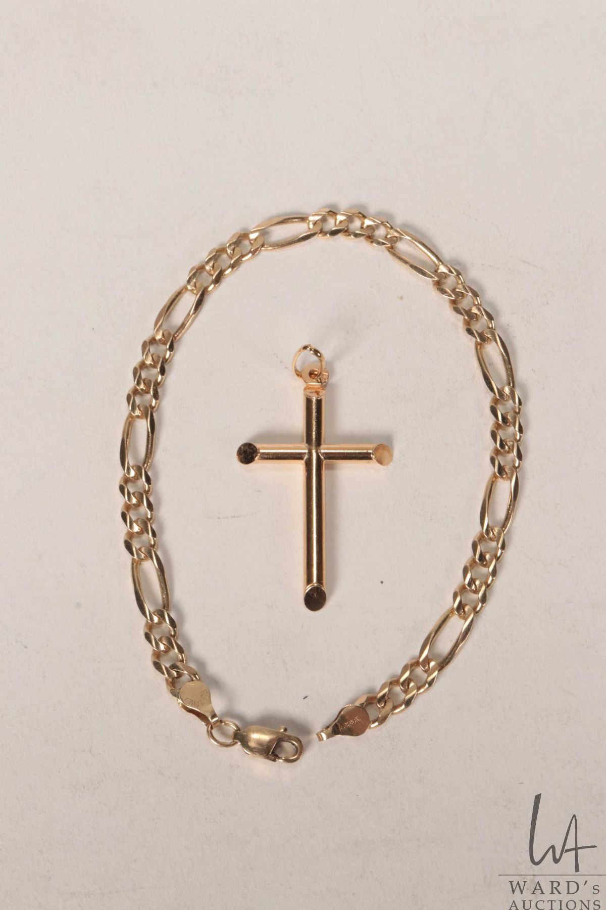 10kt yellow gold 7 1/2" curb chain and a 10kt yellow gold cross pendant
