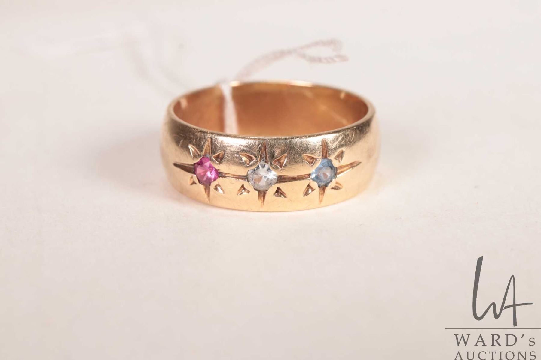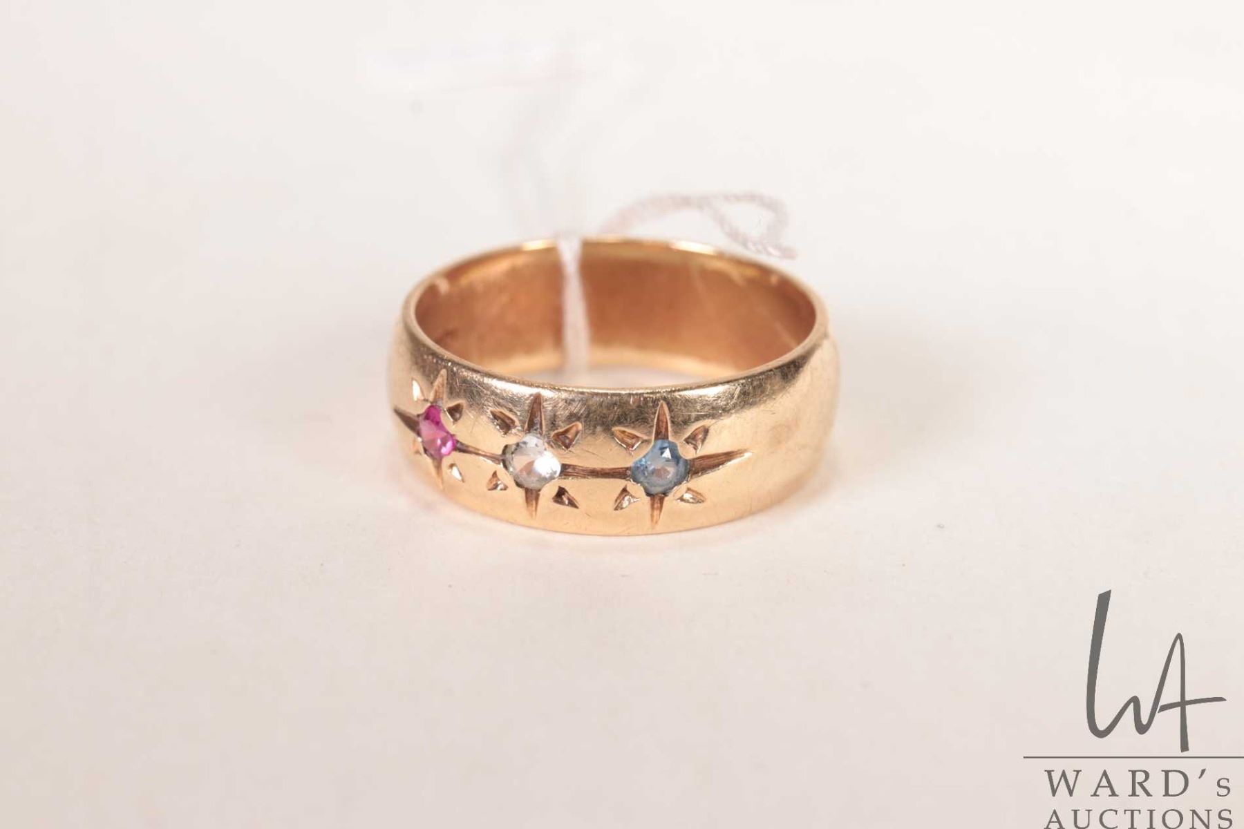 10kt yellow gold band set with three coloured gemstones, size 8