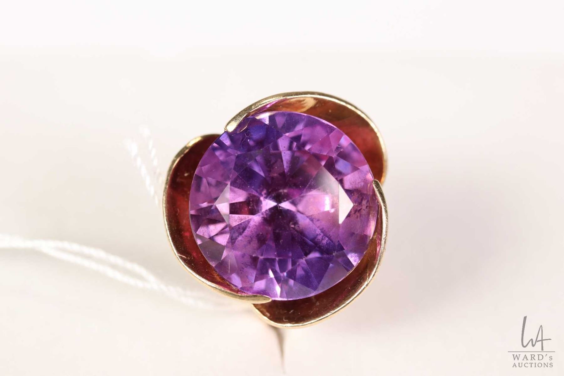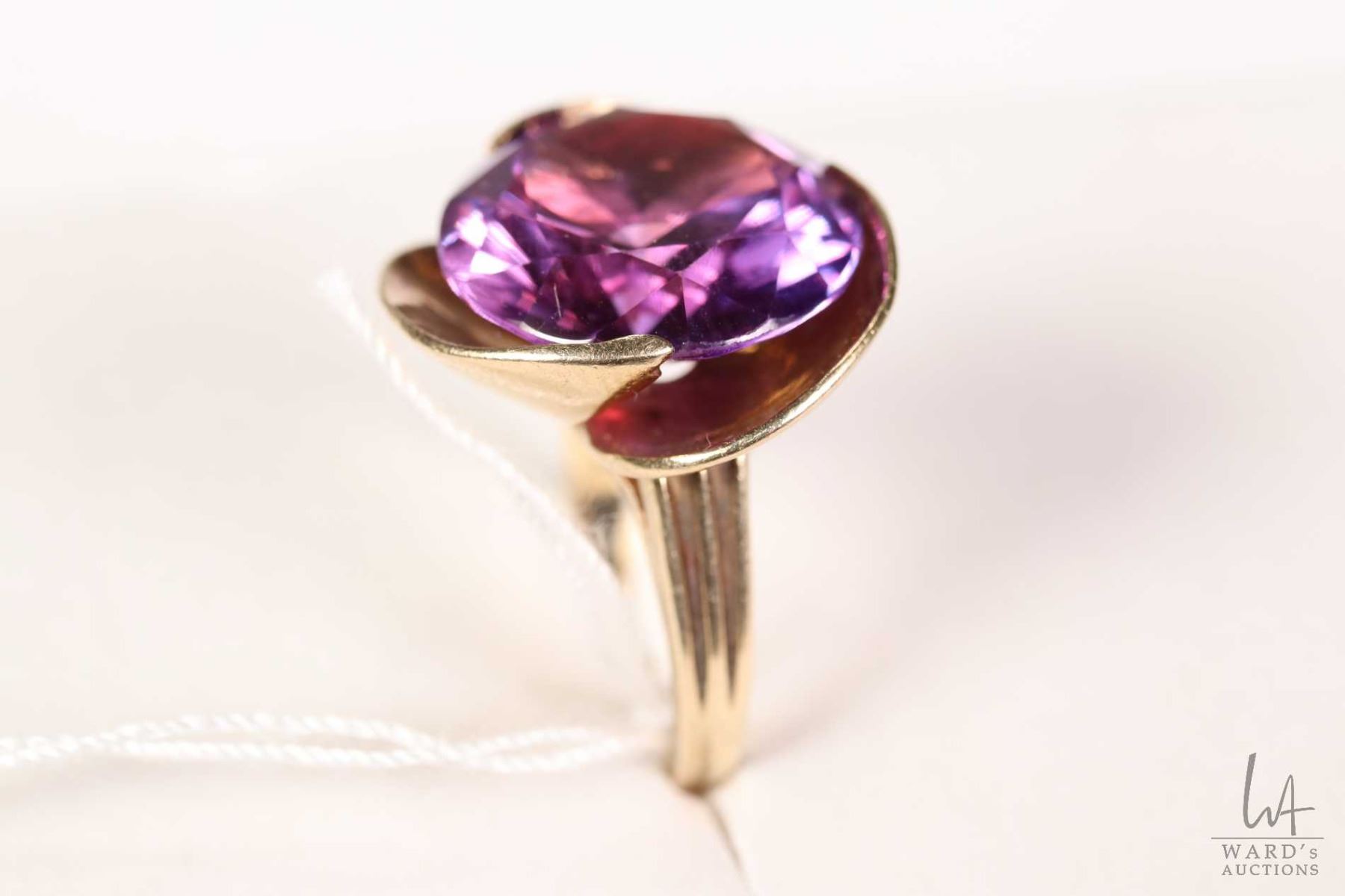 10kt yellow gold flower motif ring set with large amethyst gemstone