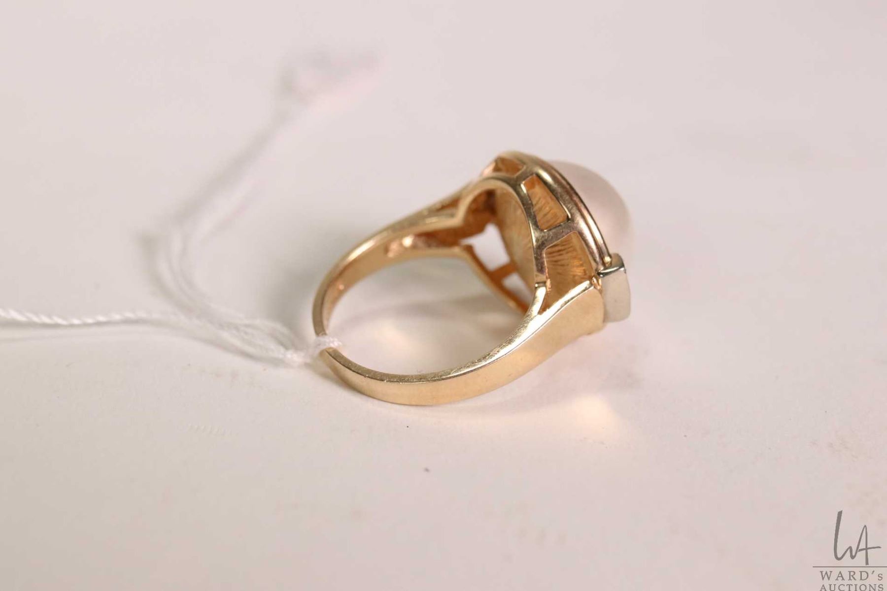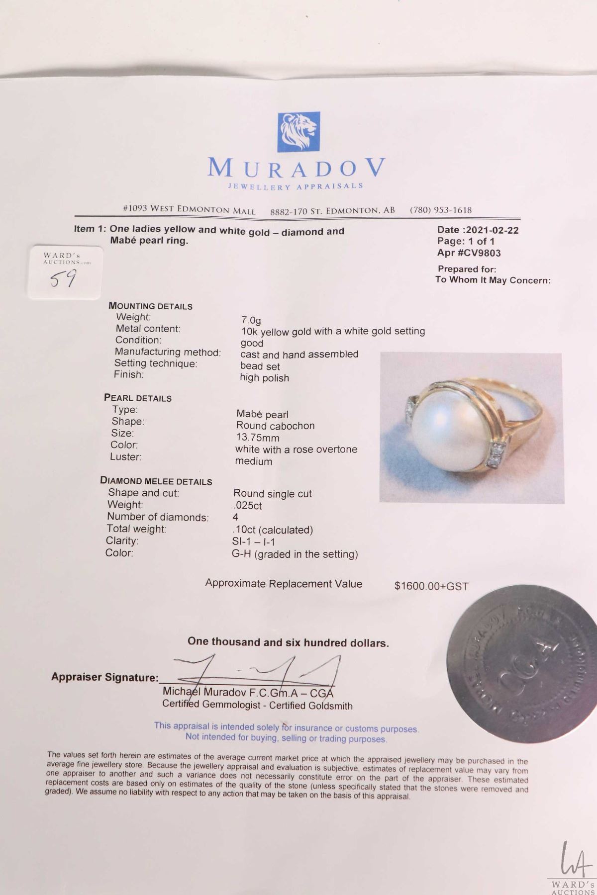 10kt yellow gold, pearl and diamond ring set with 13.75mm Mabe pearl and .10ct of round white diamonds. Retail replacement value $1,600.00