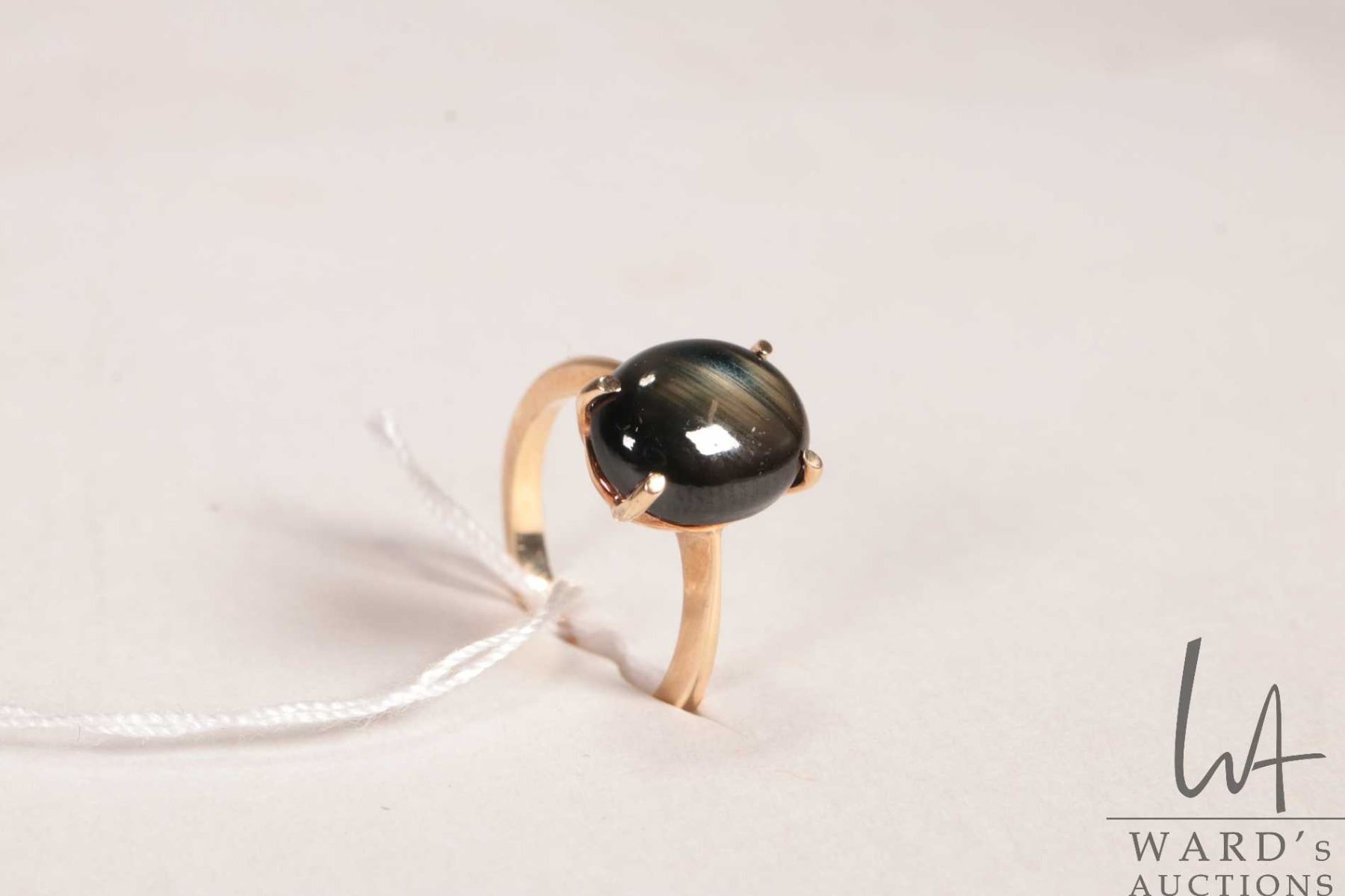 10kt yellow gold ring set with black cabochon gemstone, size 5.5