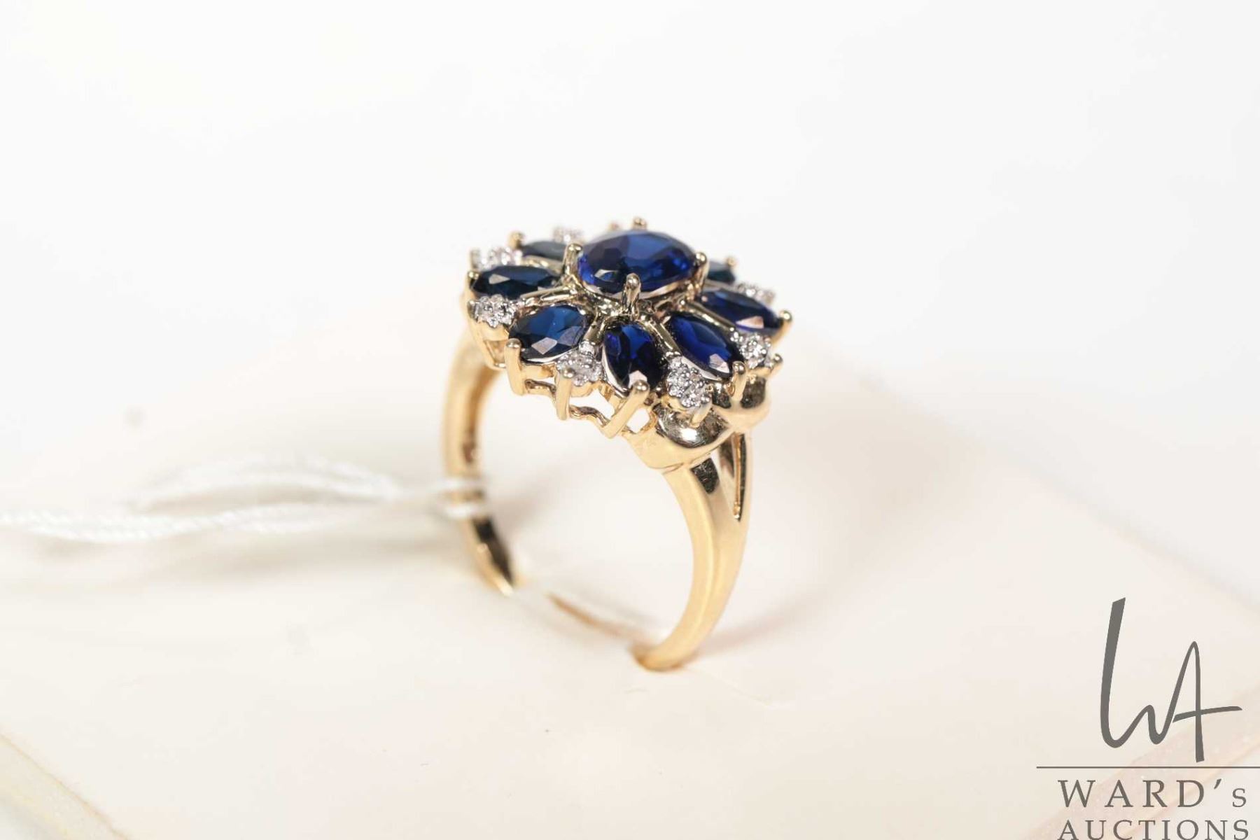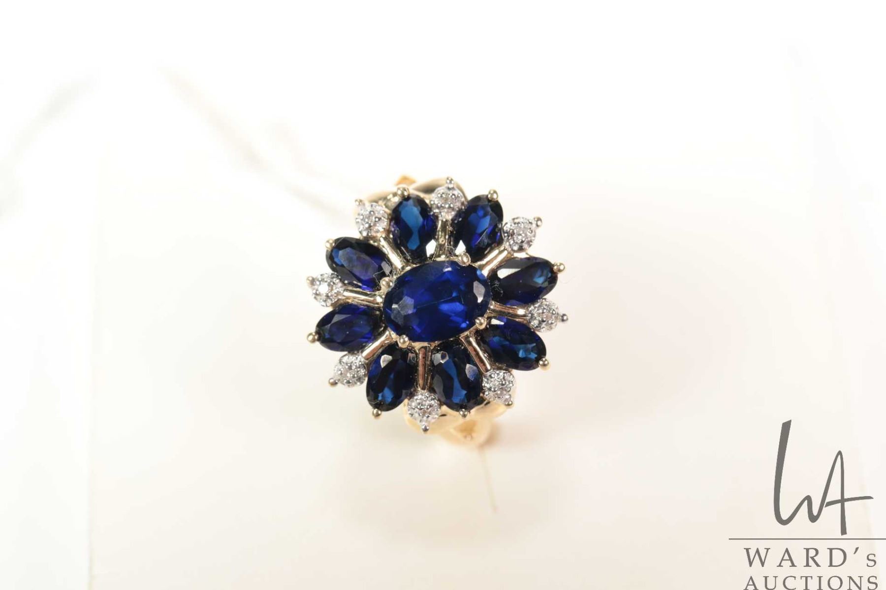 10kt yellow gold ring set with blue sapphires and accent diamonds, size 6.75