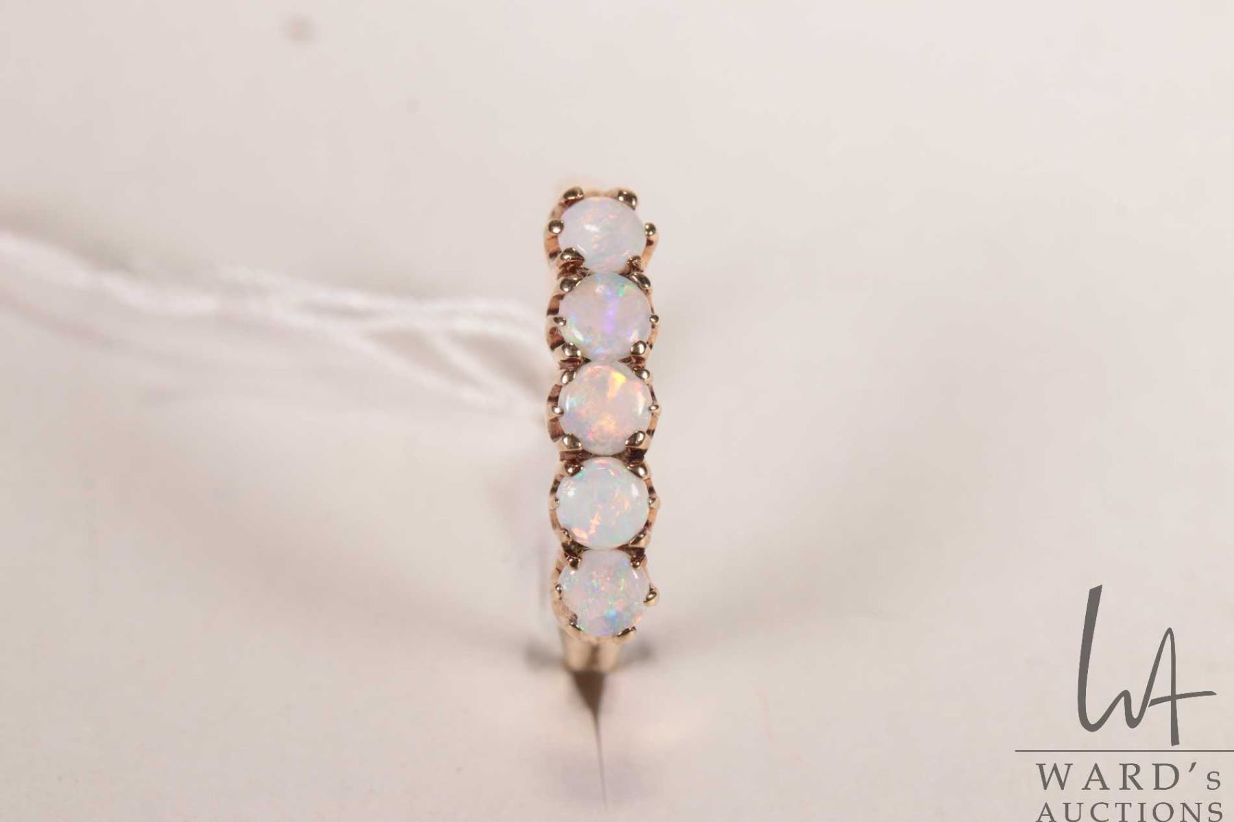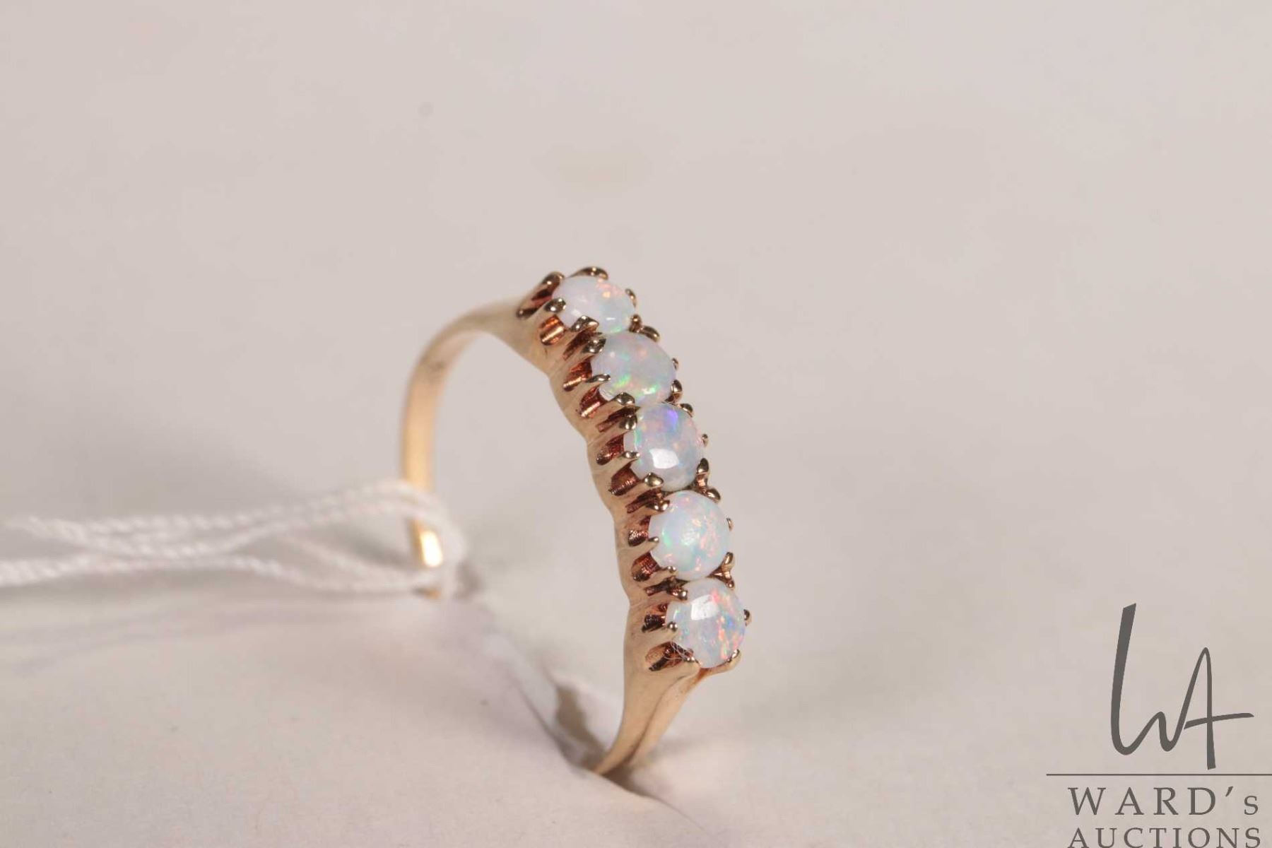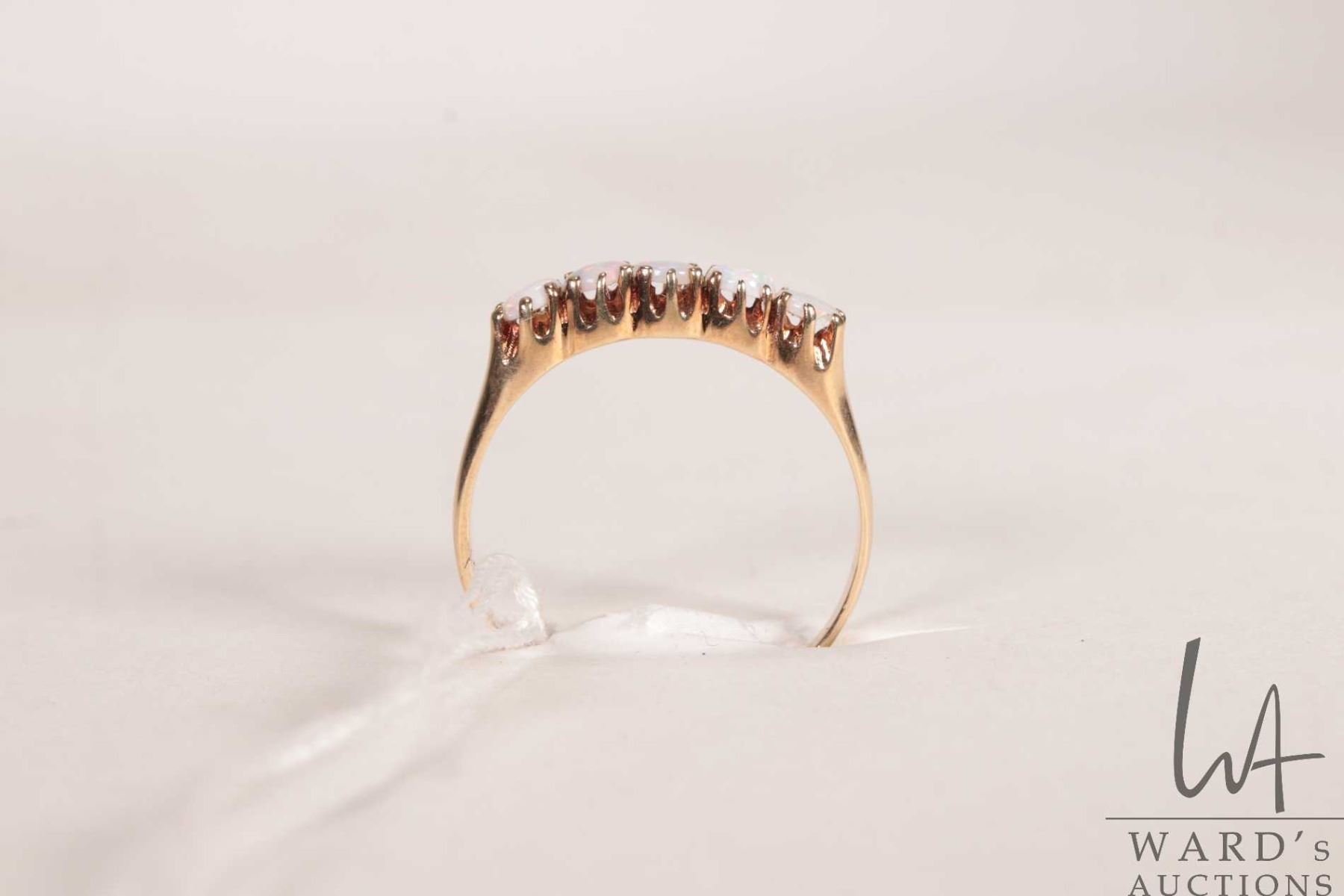 10kt yellow gold ring set with five opal gemstones, size 8.25
