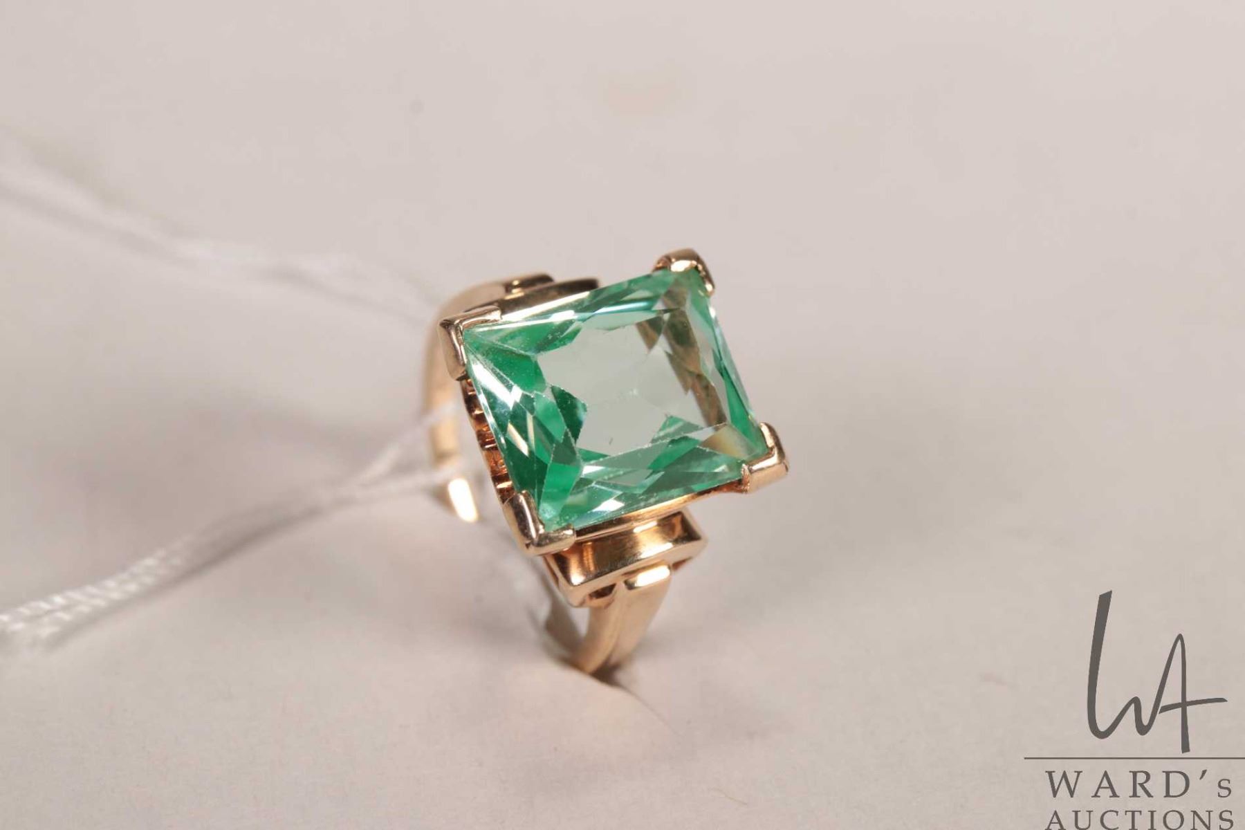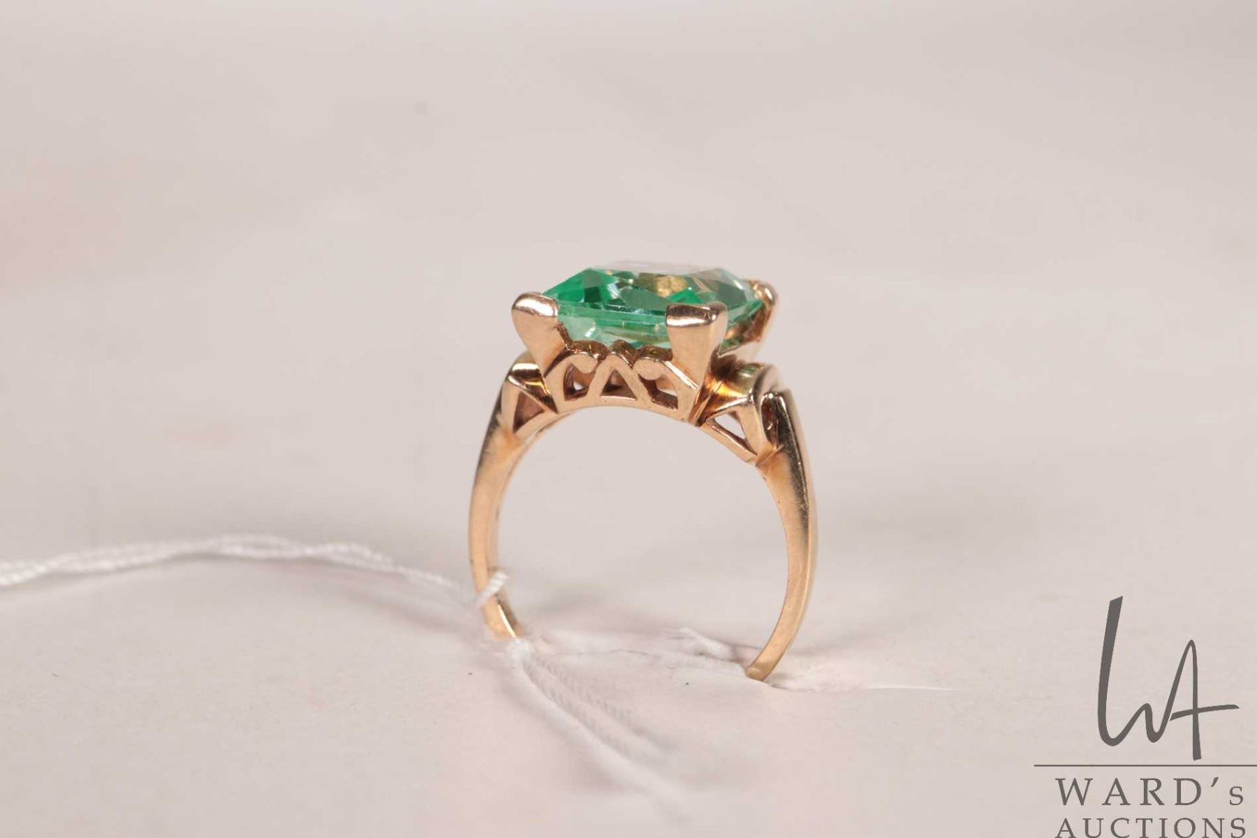 10kt yellow gold ring set with green emerald cut gemstone, size 6.25