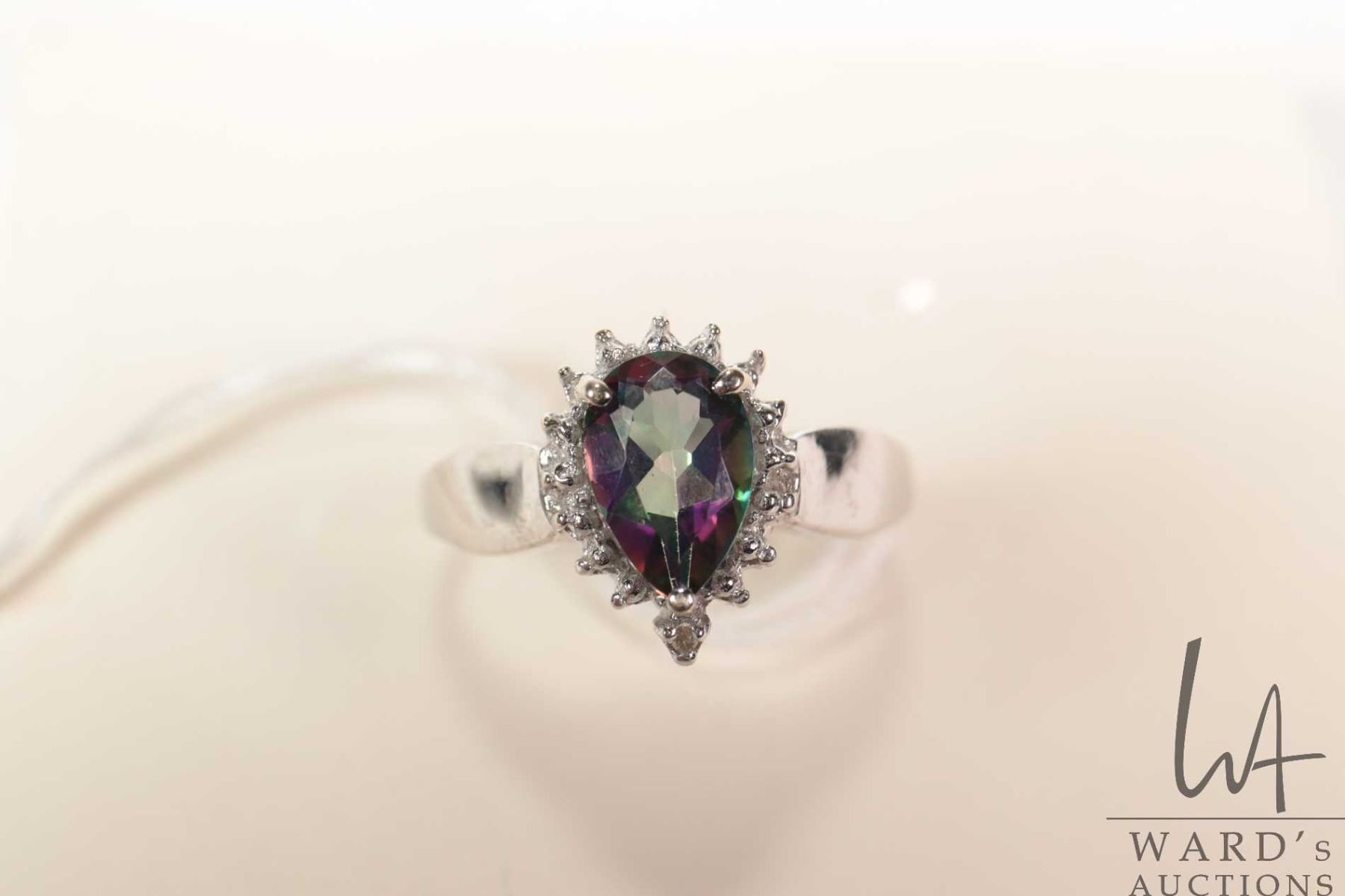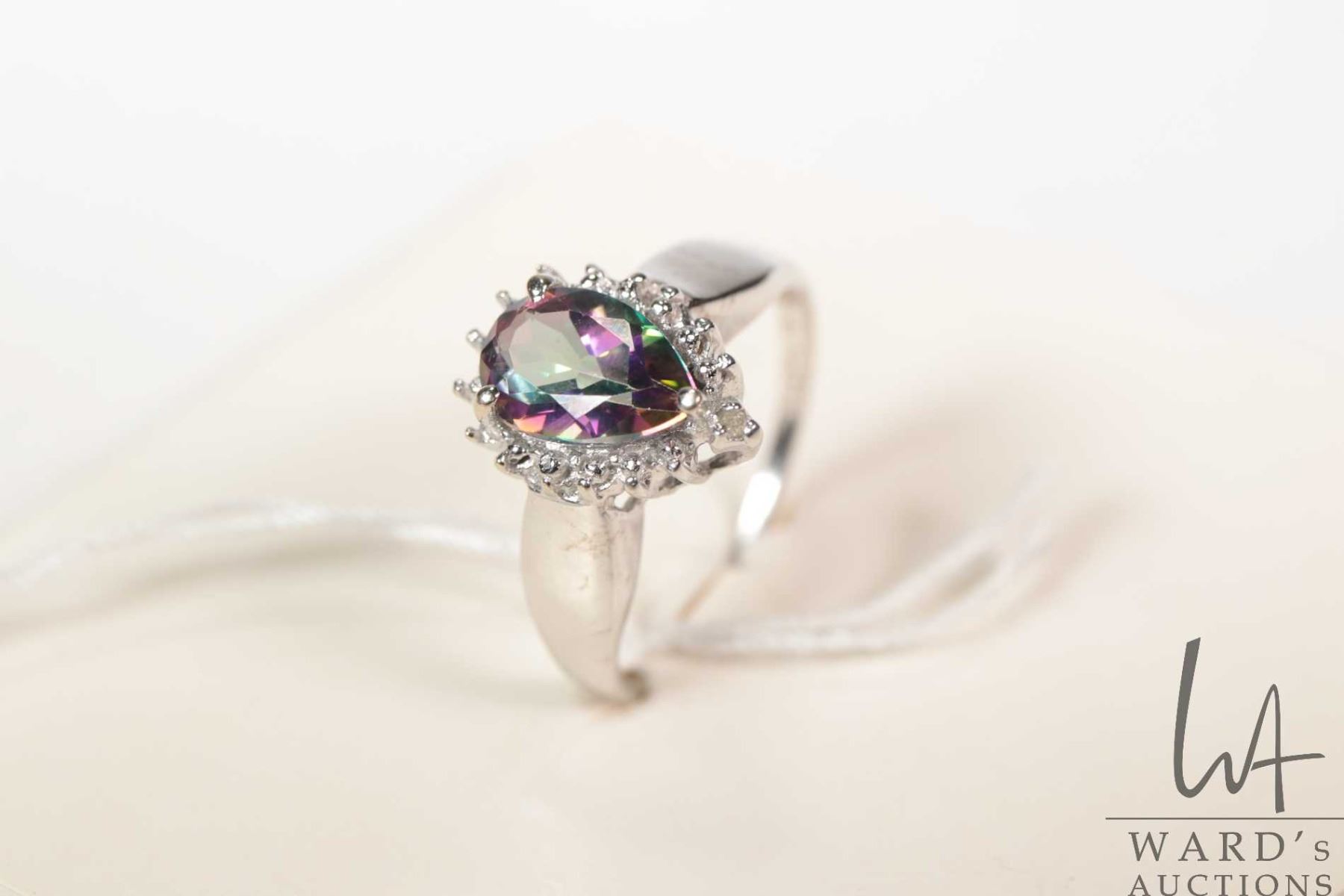 10kt yellow gold ring set with pear shaped mystic topaz and diamond accents, size 7.25