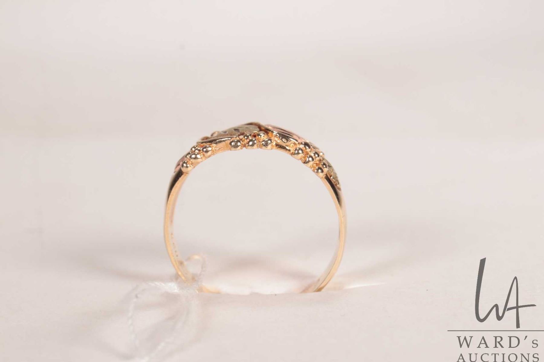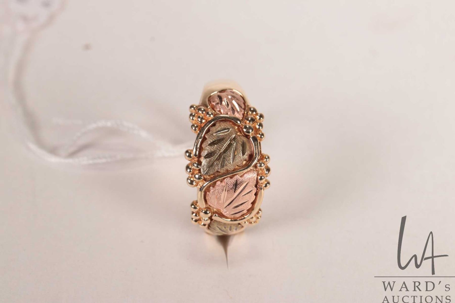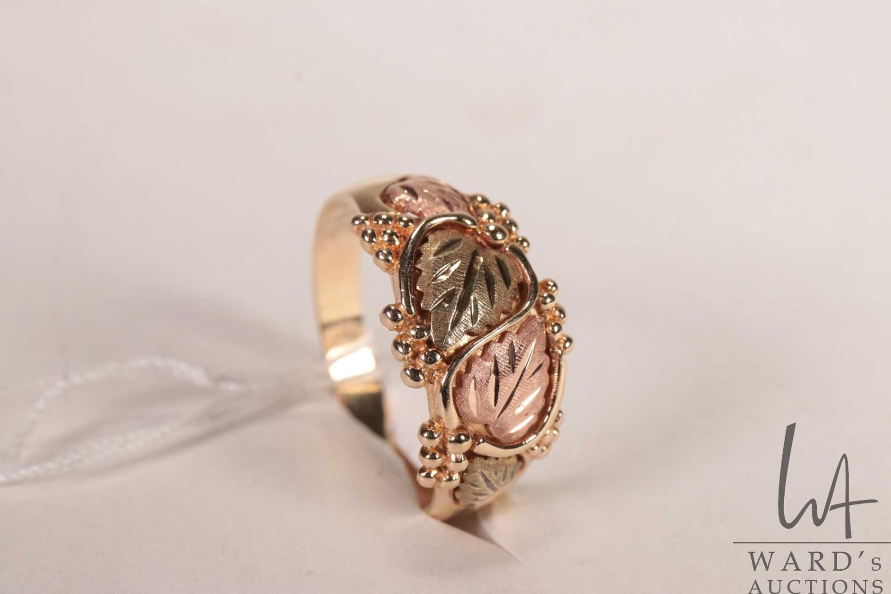 10kt yellow, green and pink gold leaf and berry motif ring, size 10.25