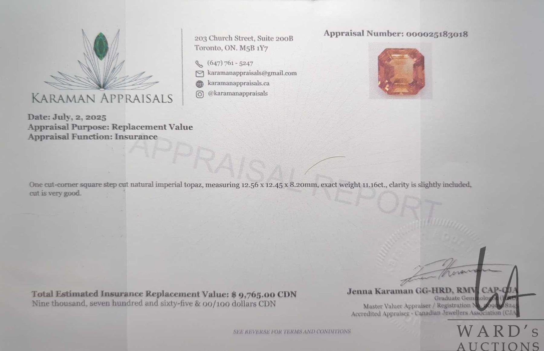 11.16 ct certified I,perial topaz gemstone, Certificate provided by consignor