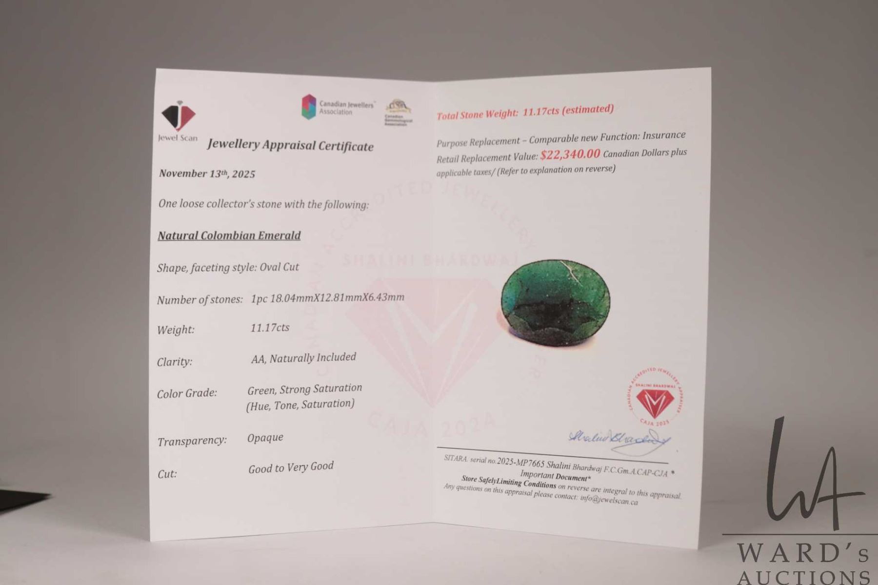 11.17 ct Columbian emerald oval cut gemstone with certificate provided by consignor