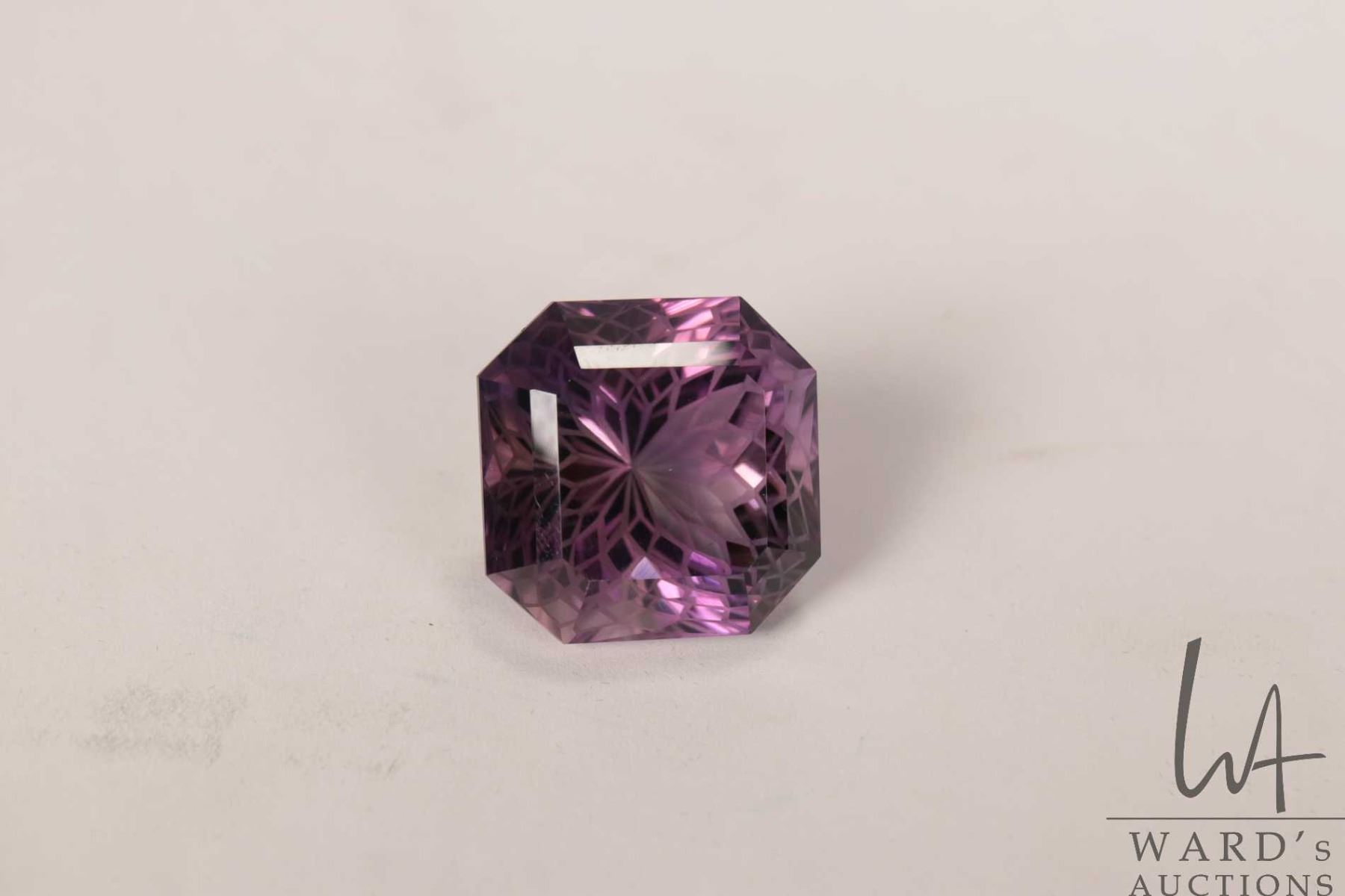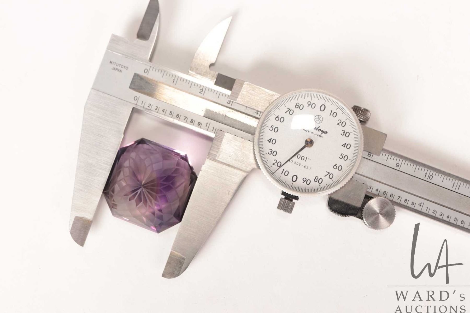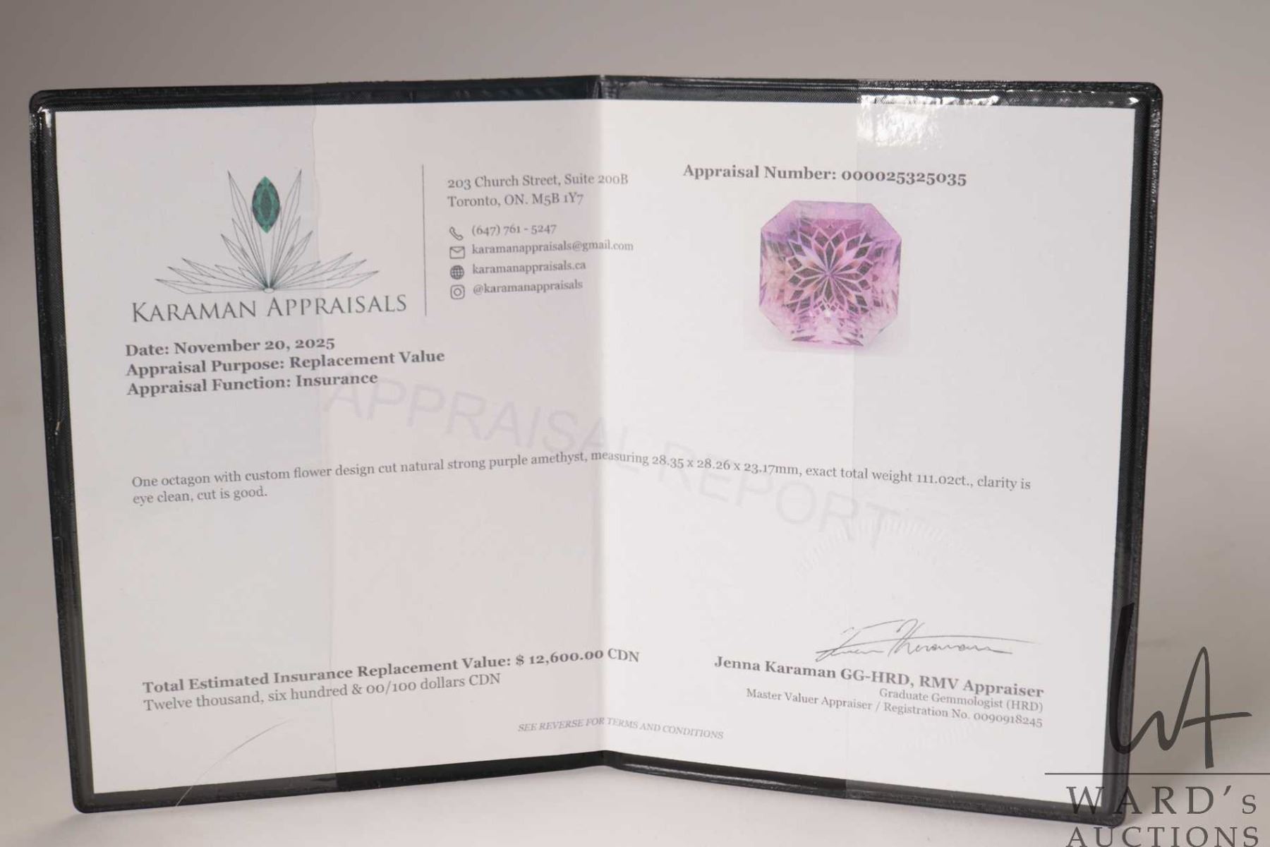 111.02 ct. custom flower design cut amethyst gemstone with certificate provided by consignor