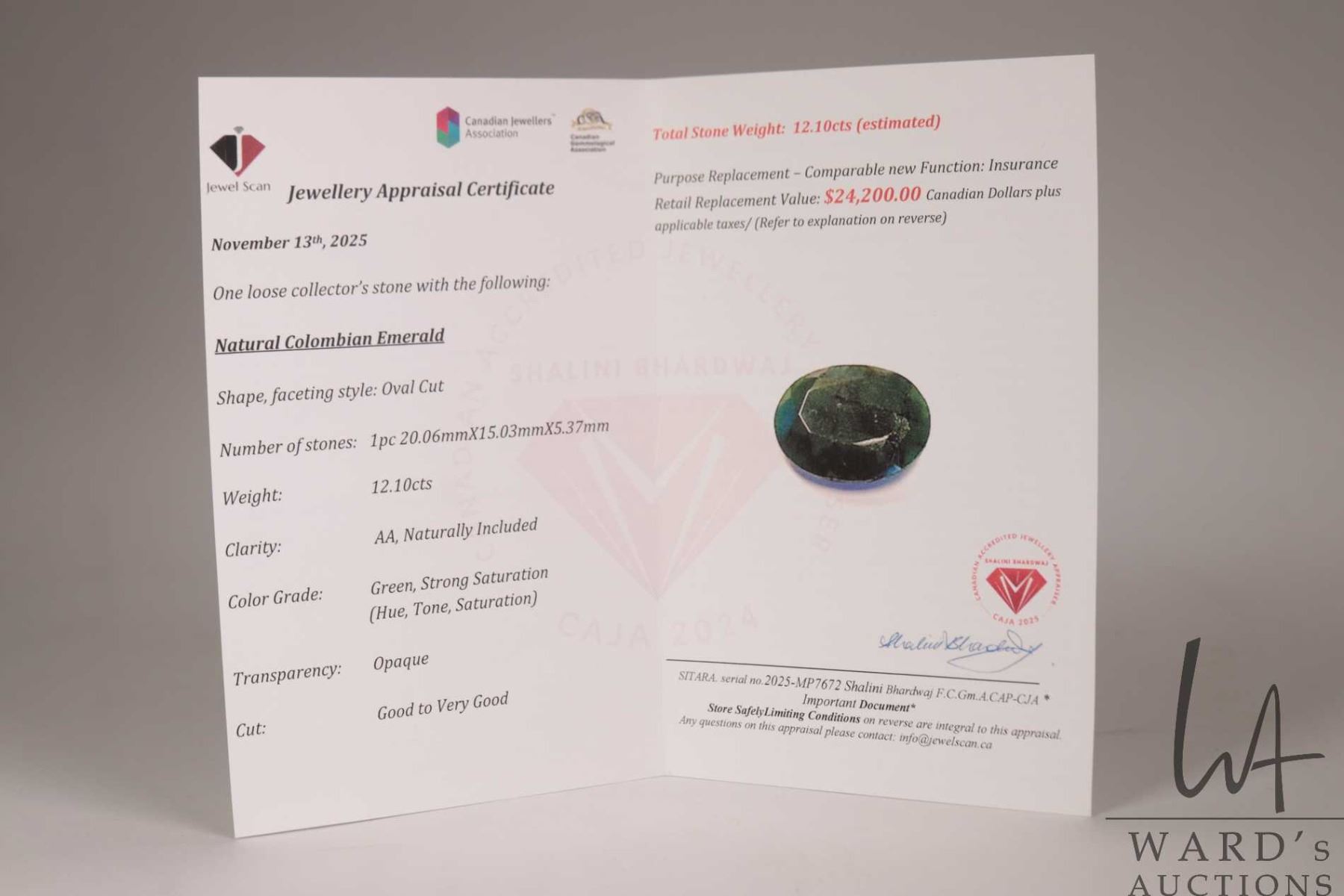 12.10 ct. Columbian emerald oval cut gemstone with certificate provided by consignor