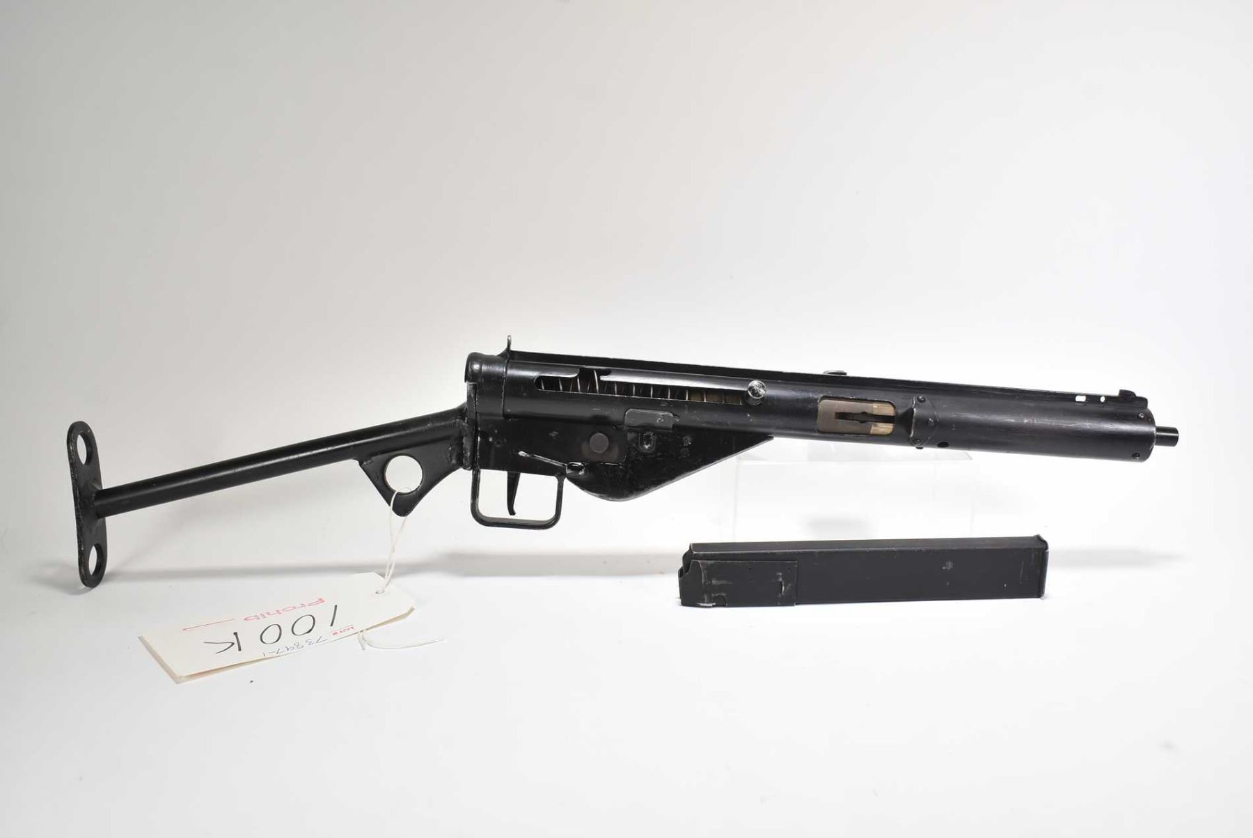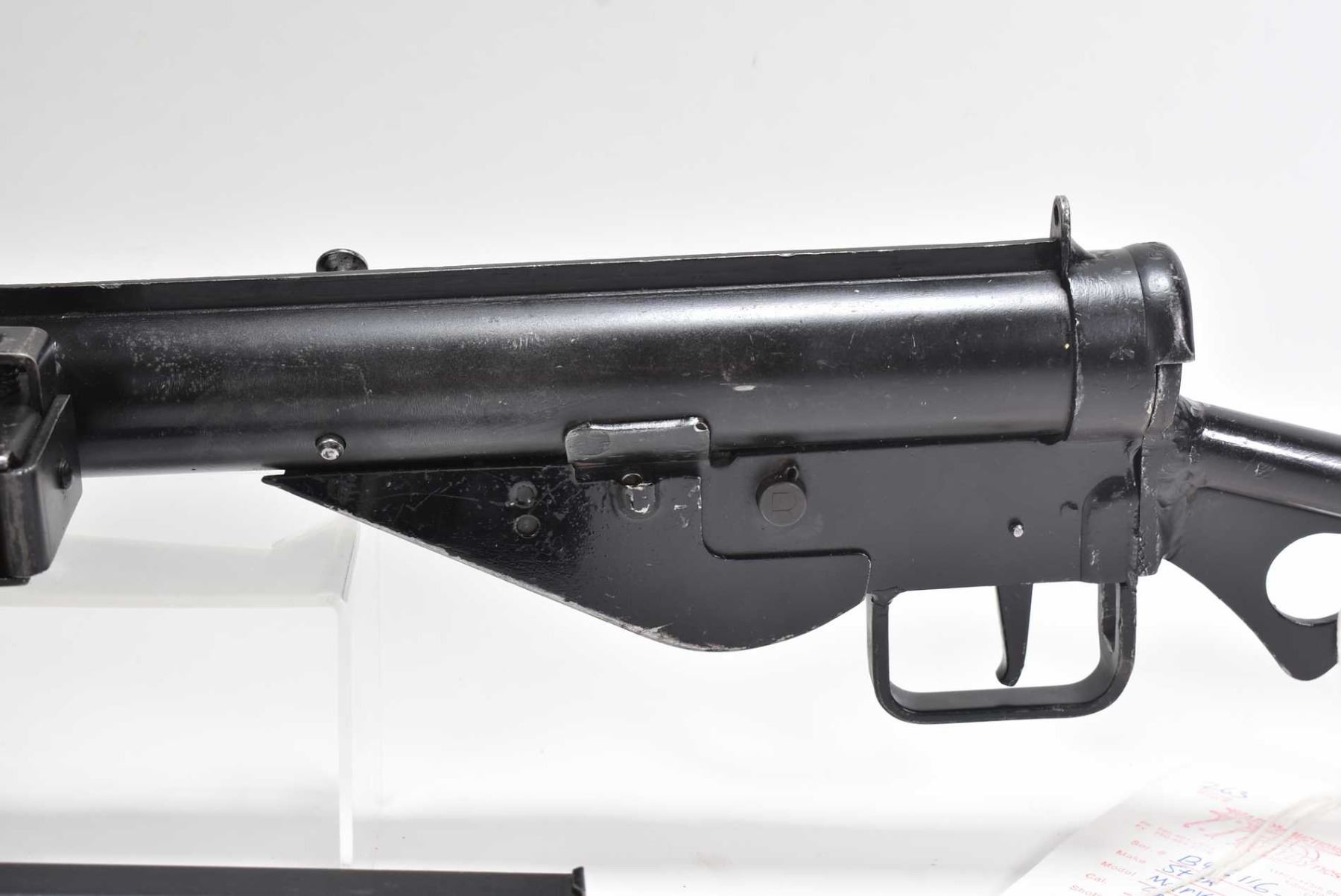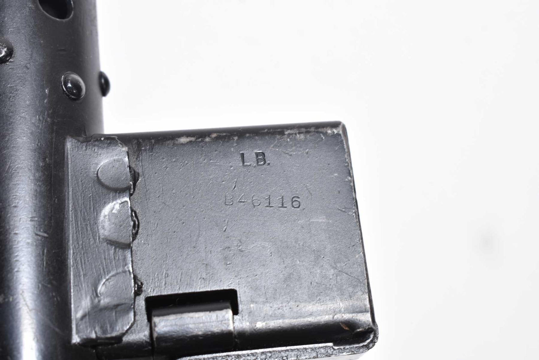 12-3 rifle Sten model MK III, 9mm five shot converted auto, w/ bbl length 197mm [Blued style finish, fixed sights and straigh stock manufactured by Lines Brothers (LB). Note 4132 stamped on bottom of trigger guard, bolt and rear mount plate on stock. Includes stick magazine pinned to five rounds. Can be sent to licensed dewatting gunsmith for deactivation and de registration] serial # B4611616889, certificate # 4811943, FRT # 73897-1 PAL required