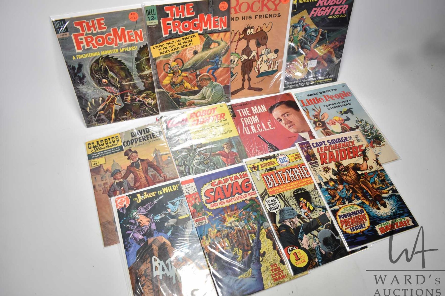 12 assorted commics including 4 Dell comics; 2 Frogman, 1 Little People & 1 Rocky, 2 Gold Key; Man from Uncle & Robot Uncle, 2 Marvel; Both Captain Savage, 2 D.C.; 1 Blitzkrieg & 1 Jokers Wild, 1 Classic Illustrated; David Copperfield & 1 Whitman; Robot Fighter