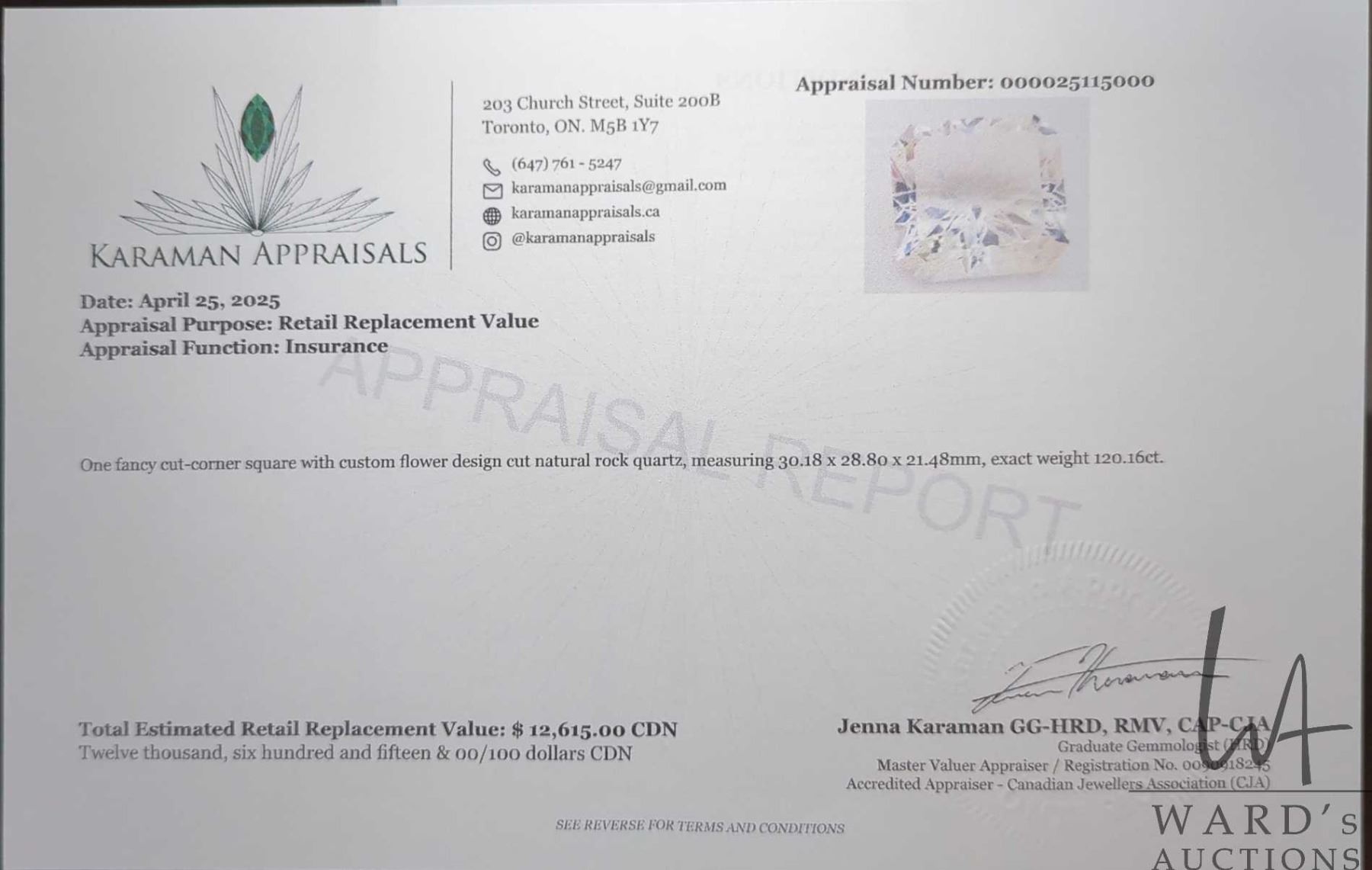 120.16ct mermaid quartz gemstone certificate provided by consignor